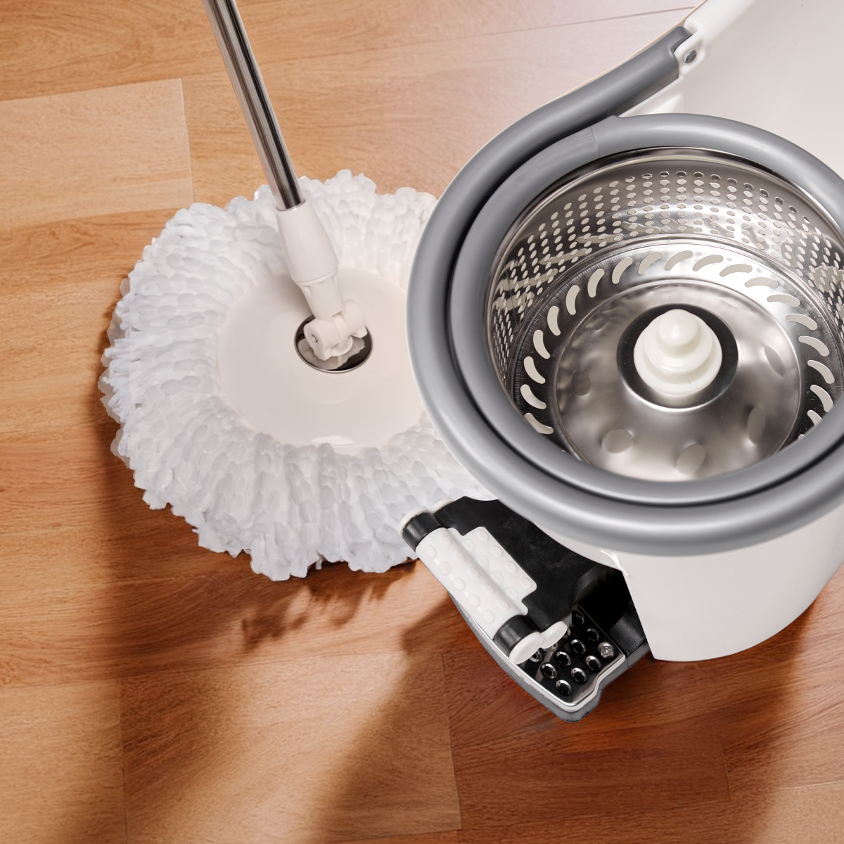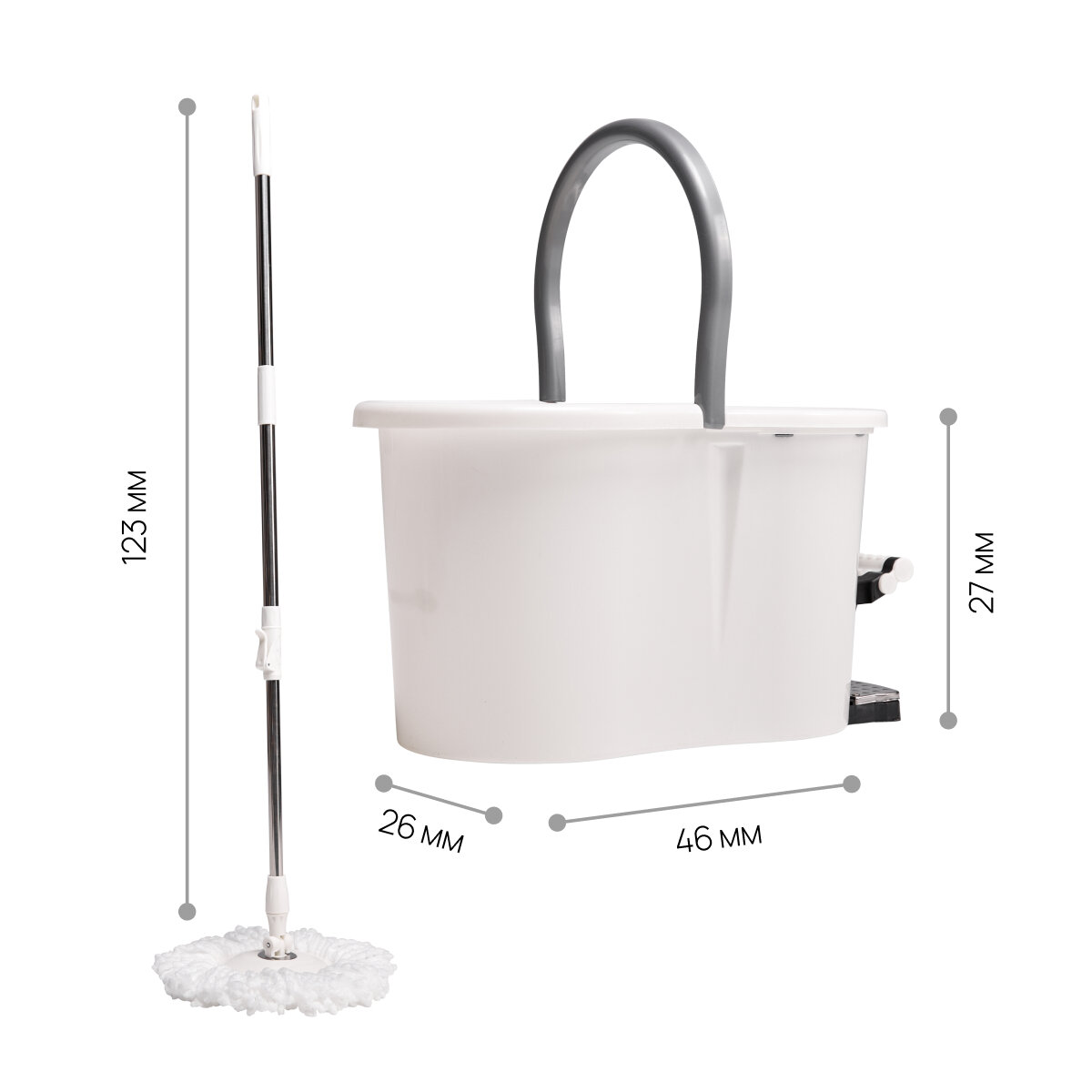 Комплект для уборки состоит из двух предметов: это круглая швабра с усиленным диском из нержавеющей стали и телескопической ручкой и ведро с отжимом и педалью. Ведро выполнено из высококачественного ABS пластика, имеет объем 9 литров и оснащено металлической корзиной для отжима. Усиленная педаль позволяет легко контролировать степень отжима без лишних усилий. Швабра для мытья полов имеет телескопическую ручку и удобный холдер из полипропилена для удобного захвата. Обратите внимание, что отжим по принципу центрифуги может осуществляться при помощи ручки, либо при нажатии на педаль. Также в комплекте 2 насадки из высококачественной микрофибры. Процесс мытья пола становится все более комфортным и эффективным.