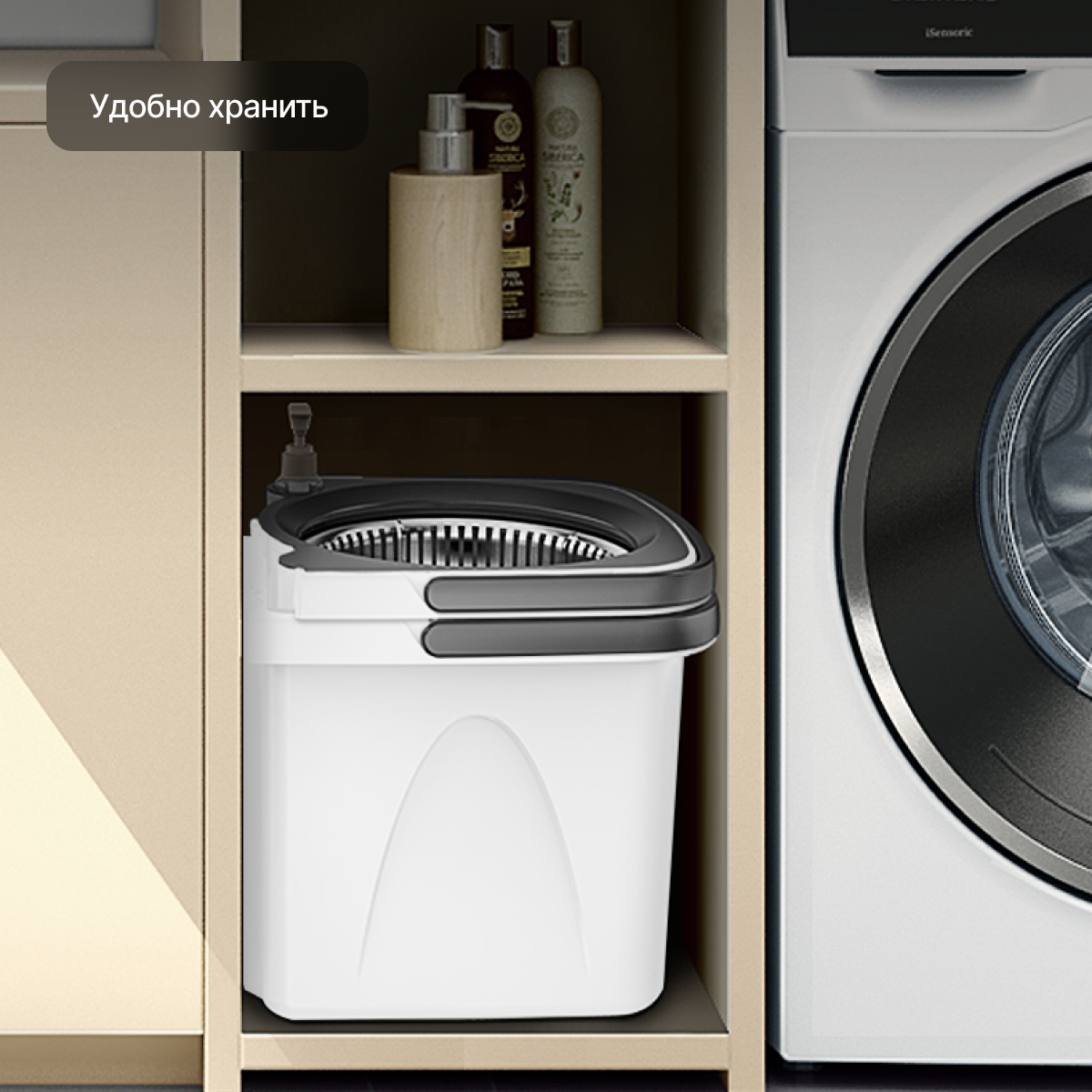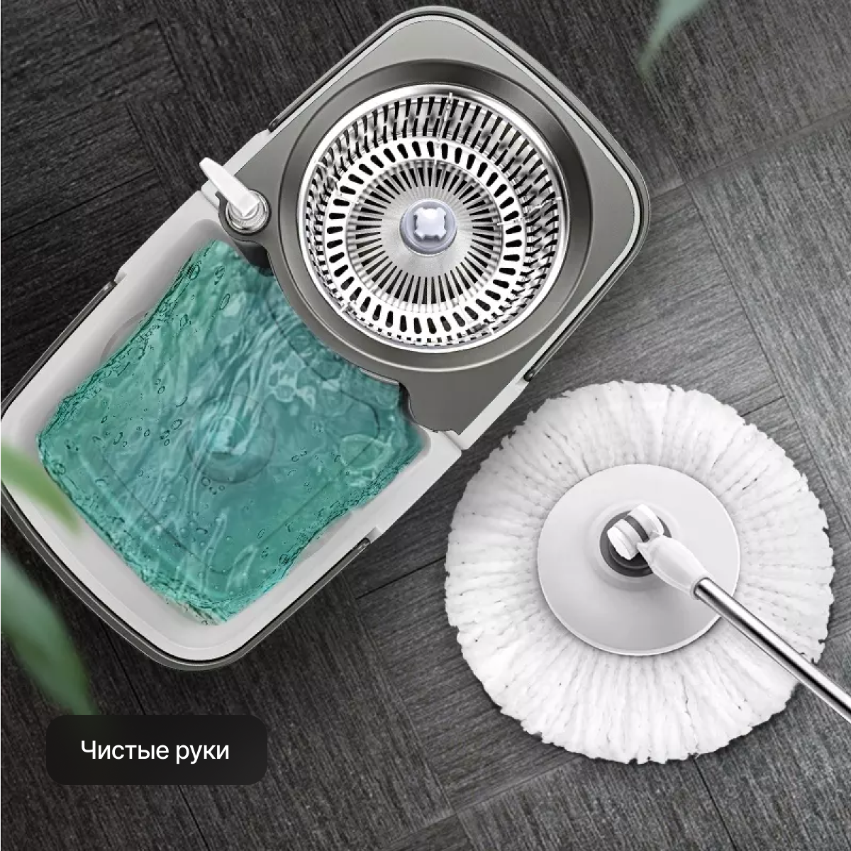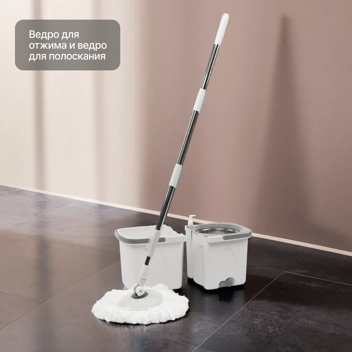 Поддержание в доме чистоты является залогом крепкого здоровья и хорошего настроения. Набор для влажной уборки станет незаменимым помощником. Набор состоит из умной швабры с отжимом, двойного ведра, двух сменных круглых насадок и дозатора для моющего средства. Швабра имеет телескопическую ручку , регулируемую по высоте, угол наклона от 45 до 180 градусов позволяет без труда мыть пол под шкафами или кроватями, выполнена из высокопрочной нержавеющей стали и пластика. Насадка из микрофибры эффективно собирает грязь, шерсть и волосы, удерживает воду до 70% лучше, чем хлопок. Подходит для всех типов полов: ламинат, кафель, линолеум. Ведро выполнено из высококачественного АВS пластика, состоит из дух отсеков, для полоскания и для отжима с центрифугой. Отсеками можно пользоваться самостоятельно. Отсек для слива воды имеет сливной клапан. Второй отсек оснащен , центрифугой, предназначенной для отжима. Ваши руки не соприкасаются с водой. Степень отжима можно регулировать самостоятельно . Набор для влажной уборки удобен в хранении, он не займет много места. Стильный дизайн и премиальное качество материалов идеально сочетают в себе последние инновации в сфере уборки.