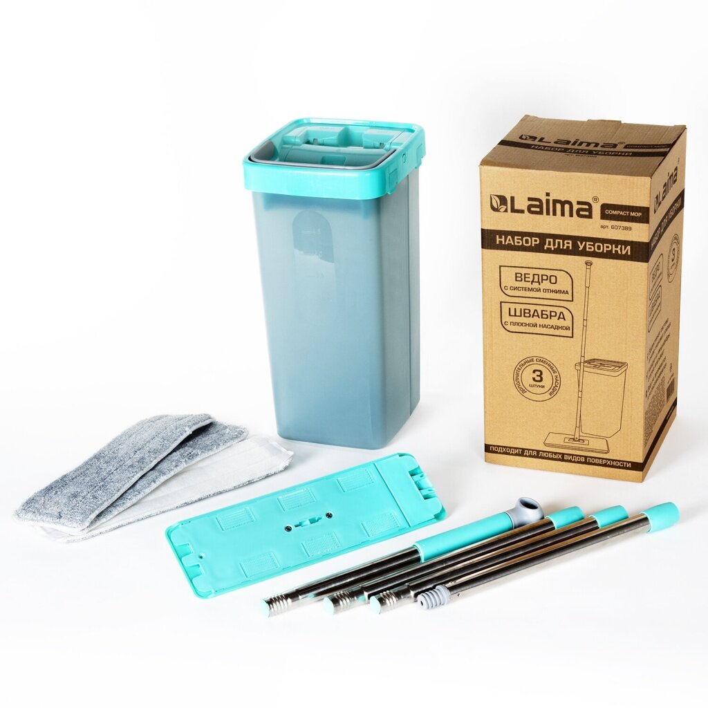 Удобный и компактный набор для уборки LAIMA идеален как для домашнего использования, так и для уборки небольшого офиса. В комплект входит: швабра + 3 насадки МОП (карманы с 2-х сторон), ведро с двумя отсеками (чистая/грязная вода) и туннельный отжим.