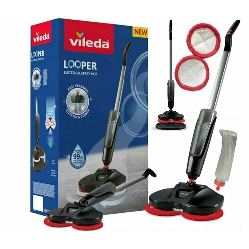 Vileda Looper - Электрическая швабра-распылитель Чистка без усилий! Чистый дом без усилий Беспроводная электрическая швабра-распылитель Looper оснащена легко наполняемым резервуаром для воды, что избавляет от необходимости использовать ведро. Два вращающихся картриджа из микрофибры высочайшего качества легко и без усилий удаляют грязь, жирные пятна и 99,9% бактерий и вирусов. Аккумуляторная швабра Vileda оснащена интеллектуальной кнопкой распыления, которая позволяет регулировать количество воды и адаптировать его к типу пола. Новая электрическая швабра С распылителем Вращающиеся подушечки из микрофибры Они без труда справятся даже с въевшейся грязью Встроенная стиральная машина С возможностью регулировки воды нажатием кнопки Готов к использованию Включает поддон для сбора капель во время зарядки и хранения. Нет ведра Съемного резервуара для воды хватает на 80 м2. Залезает даже под мебель. Беспроводная связь Время работы от батареи до 35 минут Экологически чистый выбор! Накладки многоразовые, их можно стирать до 60 раз! Откройте для себя сильные стороны Vileda Looper Вращающиеся подушечки из микрофибры, которые справятся даже с въевшейся грязью Встроенный опрыскиватель с регулировкой воды Wireless! Всегда готов к работе после зарядки Съемный резервуар для воды, достаточно для 80 м2 - нет необходимости носить с собой ведро Эргономичный - залезает даже под мебель Многоразовые прокладки - их можно стирать до 60 раз! Экологически чистый выбор Технические данные В комплектацию входят: 2 рефилла, корпус, ручка, зарядное устройство и подставка. Продукт беспроводной Вес: 1,5 кг без подушечек/воды, вся упаковка 3 кг Размеры коробки: 57,5 х 14,5 х 32,8 см. Можно сложить до высоты 40 см. Время работы от батареи до 35 минут Время зарядки 210 минут Емкость бутылки с водой 450 мл Длина зарядного кабеля 1,5 м