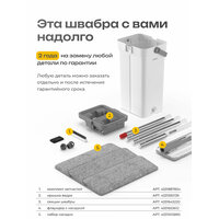 Набор включает 4 насадки, premium качества, которых вам хватит на продолжительный срок использования. Двухкамерное большое ведерко объемом 10 литров имеет удобные отверстия для слива воды, а наша вращающаяся на 360 градусов моющая часть, обеспечивая максимальное удобство в процессе мытья различных поверхностей.