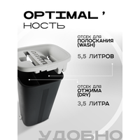 Швабра с отжимом и ведром – идеальное решение для аккуратной и эффективной уборки. Швабра для мытья полов снабжена ведром объёмом 9 литров, что позволяет одновременно собирать достаточное количество воды и моющих средств для обработки пола. Длина швабры составляет 128 см, обеспечивая комфортное использование без необходимости наклоняться или приседать, что снижает нагрузку на спину.