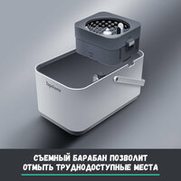 Topohome SuperSpinMop - швабра с прямоугольным ведром и барабанным отжимом, является продуктом продуманных инженерных изысканий команды, которая занимается производством товаров для уборки (в частности швабр с отжимом) уже более 10 лет. Корпус ведра с ручкой выполнен из полипропилена высокого качества и имеет двойное дно. Барабан для отжима насадки съемный и, в отличии от своих аналогов, интегрирован в пластиковый кожух, который заметно снижает уровень шума при кручении. На дне ведра расположен многоступенчатый механизм очистки из термопластичной резины и полипропилена: щетка - удалит шерсть и волосы, ролики - выведут с насадки пятна глубокого проникновения. Палка швабры изготовлена из нержавеющей стали, имеет телескопический механизм для регулировки высоты шеста. На платформе швабры встроен интуитивный фиксирующий модуль быстрой смены насадки с кнопкой, что позволяет крепко фиксировать и оптимизировать время на ее замену. Сама насадка сделана из сплетенных в толстый слой нитей микрофибры. Благодаря этому она эффективно справляется с загрязнениями, быстро сохнет и имеет увеличенные абсорбирующие свойства. Подходит как для твердых (кафель, плитка, камень, кварц винил), так и для более капризных поверхностей (паркет, паркетная доска, ламинат), которые нельзя подвергать сильному увлажнению. Можно стирать в стиральной машине при температуре не выше 40 градусов, без использования кондиционера. Размер насадки: d-40 см. Сменные насадки артикул - 102872167402.