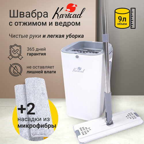 Универсальная и удобная швабра для уборки с системой отжима Karisad– это идеальное решение для современных хозяек, которые любят чистоту, но хотят экономить своё время и силы. В комплект профессиональной швабры входит: моющая швабра с прочной составной металлической ручкой и плоским пластиковым основанием, ведро на 9 литров из качественного пластика с отжимом, тряпка для мытья пола из профессиональной микрофибры (набор 2 шт.) Надёжное крепление микрофибры на клипсы с двух сторон, а также липучку по всей площади швабры придаёт ровное прилегание поверхности швабры к полу, не пропуская не единой песчинки грязи. Система для уборки дома разработана таким образом, что вам даже не придётся мочить руки в грязной воде и заниматься полосканием вручную. При мытье пола, пользуясь двухкамерным ведром, в отсеке с водой вы мочите насадку с тряпкой из микрофибры или применяете его для полоскания, а во втором отжимаете. Ведро с механизмом вертикального отжима позволяет выбрать подходящий уровень влажности при мытье различных поверхностей (от 2 до 6 отжимов). Универсальная моющая швабра с ручкой длиною 125 см хорошо подходит для труднодоступных мест. Нижняя насадка швабры снабжена бампером и водосгоном, что позволит избежать повреждений мебели при контакте с ней и убрать быстро воду.