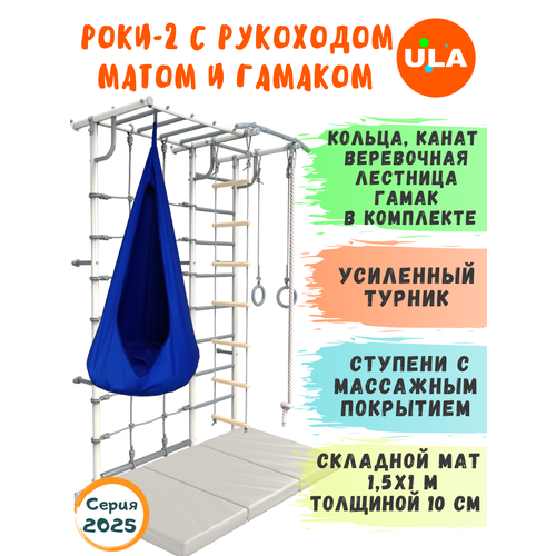 Шведская стенка Роки-2 с рукоходом, гамаком и матом 1,5х1 м, цвет пастель-синий: сравнение цен, характеристики, фото, актуальное наличие и цены.