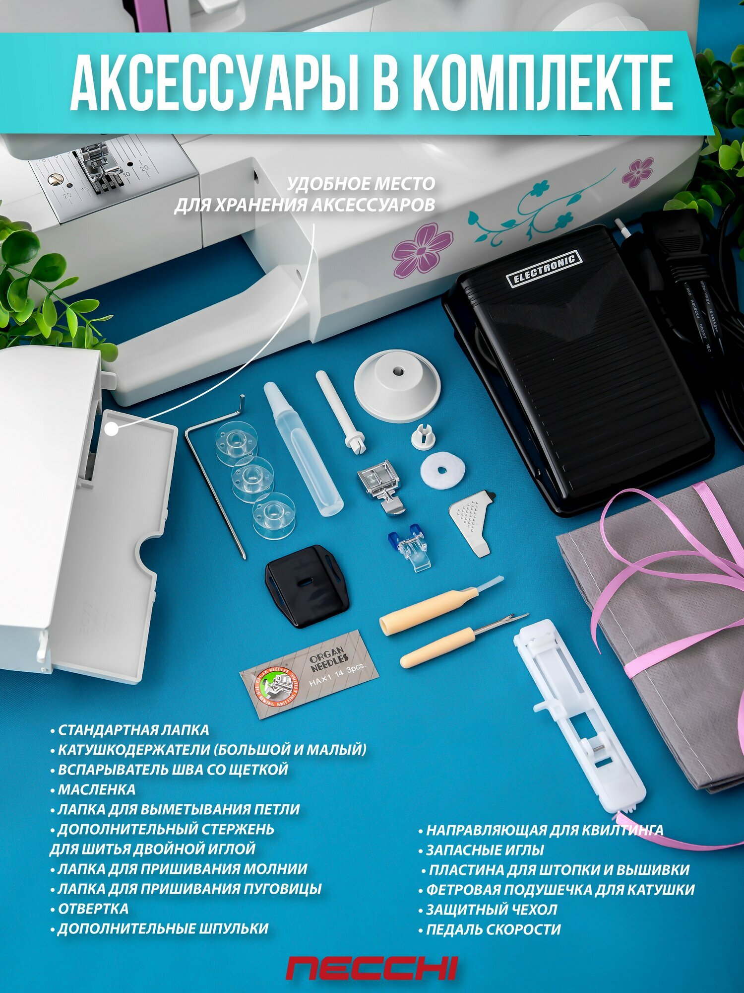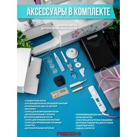 Мягкий чехол, набор игл, катушкодержатель, распарыватель с кисточкой, лапка для петли автомат , шпульки (3шт.),отверка, лапка для пришивания пуговиц, лапка для вшивания молнии, направляющая для стежки, накладка для отключения зубчатой рейки, масленка, держатель катушки бол. и мал.