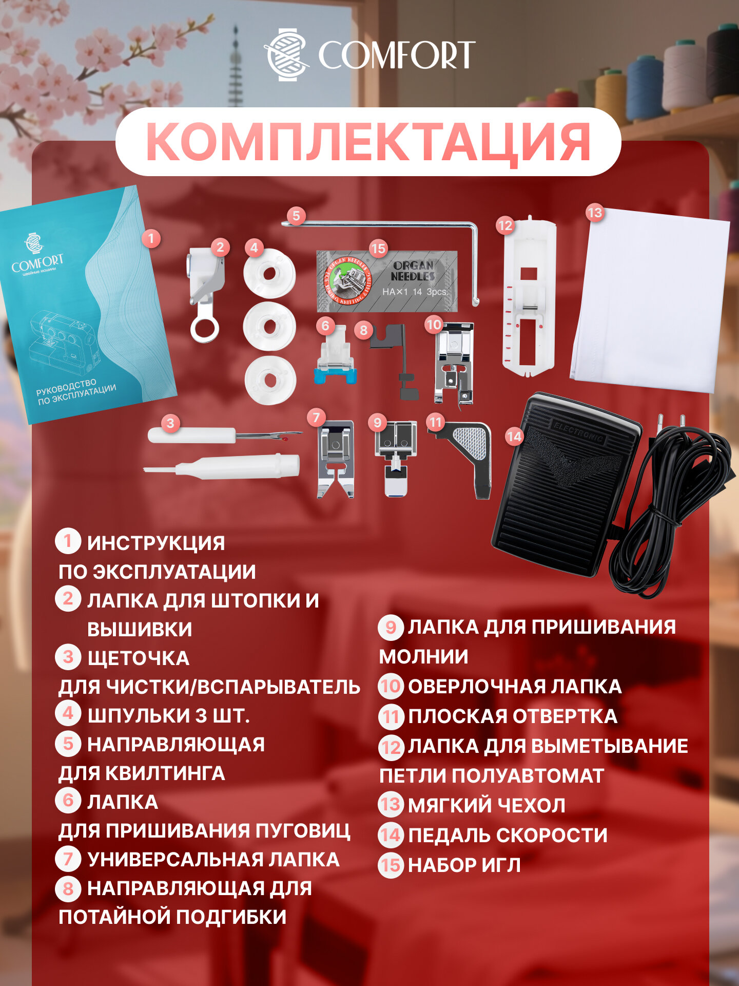 | Подробная комплектация | Инструкция, распарыватель, набор игл(3шт.) , шпульки (3 шт.), лапка для вшивания молнии , пластина для потайной подгибки , рамка для петли полуавтомат , направляющая для квилтинга, лапка оверлочная , отвертка, лапка для пришивания пуговиц. |