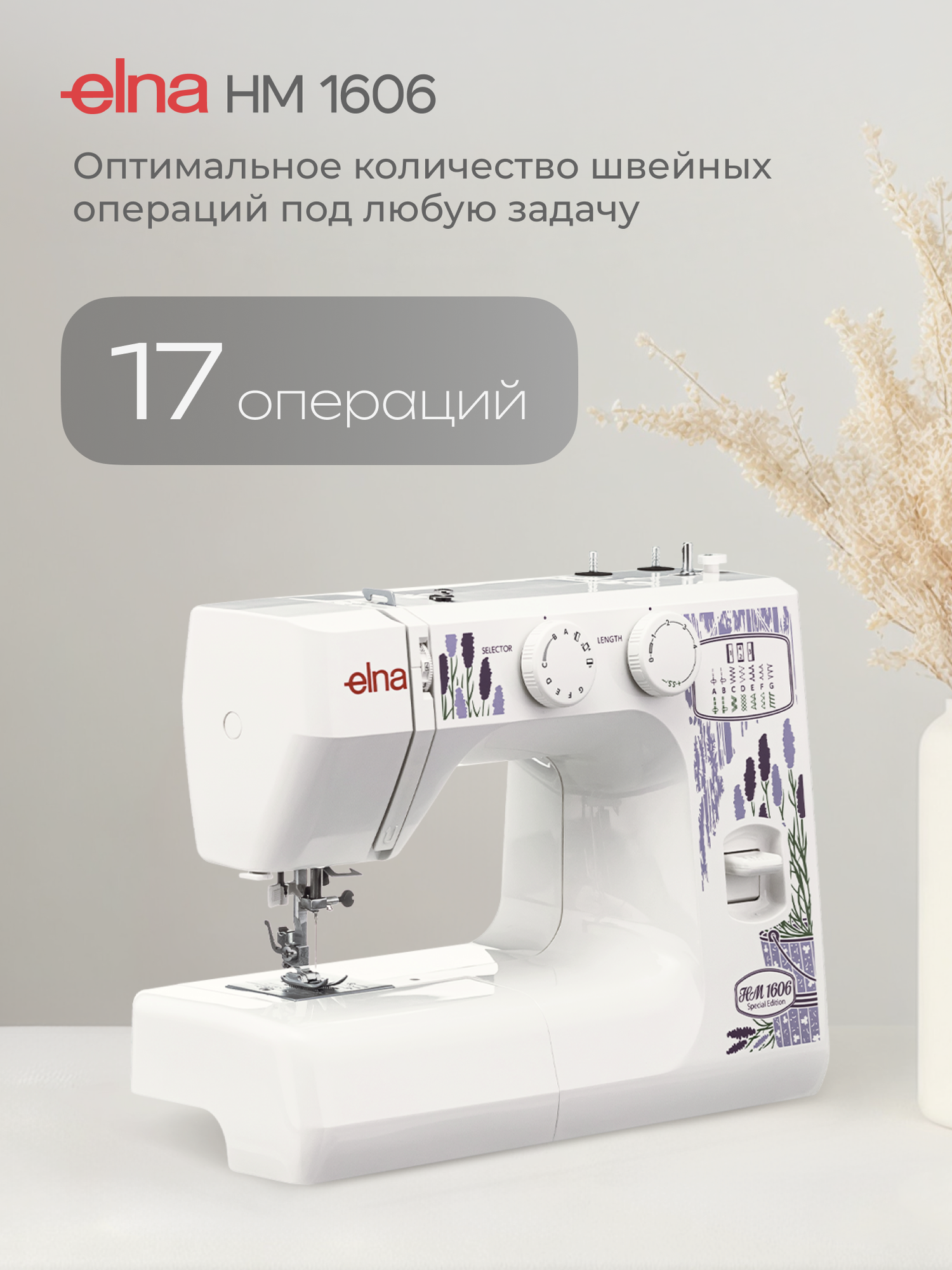 Электромеханическая швейная машина Elna HM1606 с вертикальным челноком порадует качественным функционалом и приятным дизайном, и станет незаменимым помощником в воплощении ваших творческих идей. Машина Elna HM1606 обладает всем необходимым набором функций: 17 швейных операций для полноценного шитья. Клавиша реверс используется при шитье назад, штопке и закрепке в конце строчек. На машинке можно прошивать широкий диапазон ткани: для плотного материала воспользуйтесь дополнительным подъёмом лапки, для узких изделий используйте рабочее пространство свободного рукава. C помощью съёмной рукавной панели можно обрабатывать узкие изделия, такие как манжеты рукавов, низ брючин, детские вещи и тд. Заправка верхней нити очень быстрая и простая благодаря пошаговой схеме на корпусе машины и встроенному нитевдевателю. Машинка простая в освоении и надежна в эксплуатации. Приятный гладкий корпус, легкий прованский дизайн с веточками лаванды в комбинации с надежностью бренда Elna станет отличным подарком и вызовет восторженные эмоции с первого стежка. Порадуйте себя и близких! 17 швейных операций: прямая сторочка (центральное и левое положение иглы), зигзаг, эластичный зигзаг, потайные строчки, трикотажная строчка, трикотажный зигзаг, строчка мережка, оверлочные строчки, петля-полуавтомат. Регулировка длины стежка от 0 до 4 мм. Регулировка ширины зигзага до 5 мм. Регулятор натяжения верхней нити. Вертикальный челнок. Рычаг обратного хода. Дополнительный подъём лапки. Встроенный нитеобрезатель. Встроенный нитевдеватель. Переключатель нижнего транспортёра. Свободный рукав. Отсек для хранения аксессуаров. Тип освещения - светодиод. Потребляемая мощность - 60 Вт. Вес нетто: 6 кг. Вес брутто: 6,7 кг. Производство - Таиланд. Гарантия: 2 года. В дополнении к машинке можно отдельно приобрести Расширительный столик Артикул: JANOME 725-813-002, увеличивающий рабочую зону (в стандартную комплектацию к швейной машинке не входит). Известный европейский бренд ELNA пользуется признанием среди специалистов швейной отрасли благодаря непревзойденному качеству, передовым инновациям и элегантному дизайну своей продукции. Дизайнерское бюро ELNA находится в Женеве (Швейцария). Производство швейных машин и оверлоков ELNA размещено на заводах всем знакомой компании JANOME в Японии, Таиланде и Тайване. Модельный ряд продукции ELNA включает в себя большой ассортимент швейных машин, вышивальных машин и оверлоков, характеристики которых продолжают улучшаться, чтобы полноценно соответствовать ожиданиям покупателей. Бренд ELNA разрабатывает машины, которые обеспечивают удобство в эксплуатации, дарят удовольствие от шитья и повышают творческий потенциал.