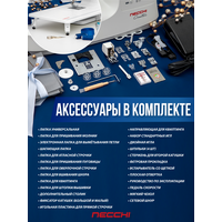 Лапки универсальная, лапка для пришивания молнии, электронная лапка для выметывания петли,шагающая лапка, лапка для атласной строчки, лапка для пришивания пуговицы, лапка для оверлочной строчки, лапка для вшивания шнура, лапка для квилтинга, лапка для штопки/вышивки, дополнительный столик, фиксатор катушек (большой и малый), игольная пластина для прямой строчки, направляющая для квилтинга, набор стандартных игл, двойная игла, шпульки (4 штуки), стержень для второй катушки, фетровая прокладка, вспарыватель со щеткой, плоская отвертка, руководство по эксплуатации, педаль скорости, мягкий чехол, сетевой шнур.