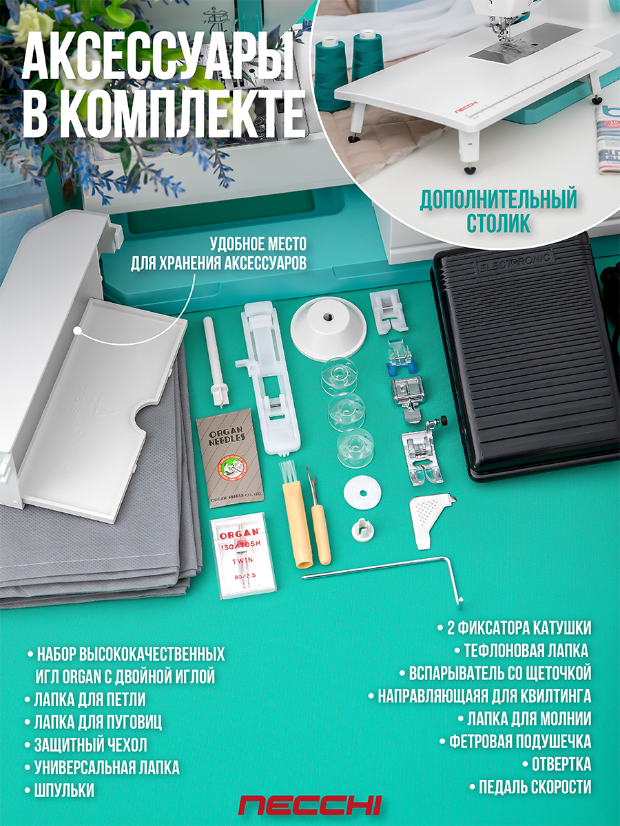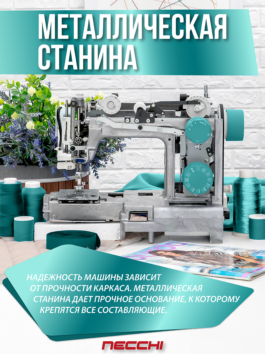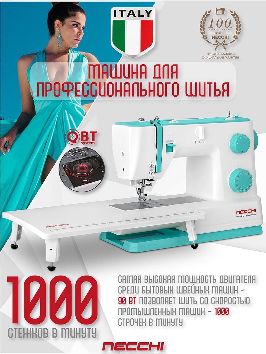 Купить Швейная машина NECCHI Q134A, 34 операции, петля автомат, дополнительный столик, нитевдеватель с доставкой по всей России.