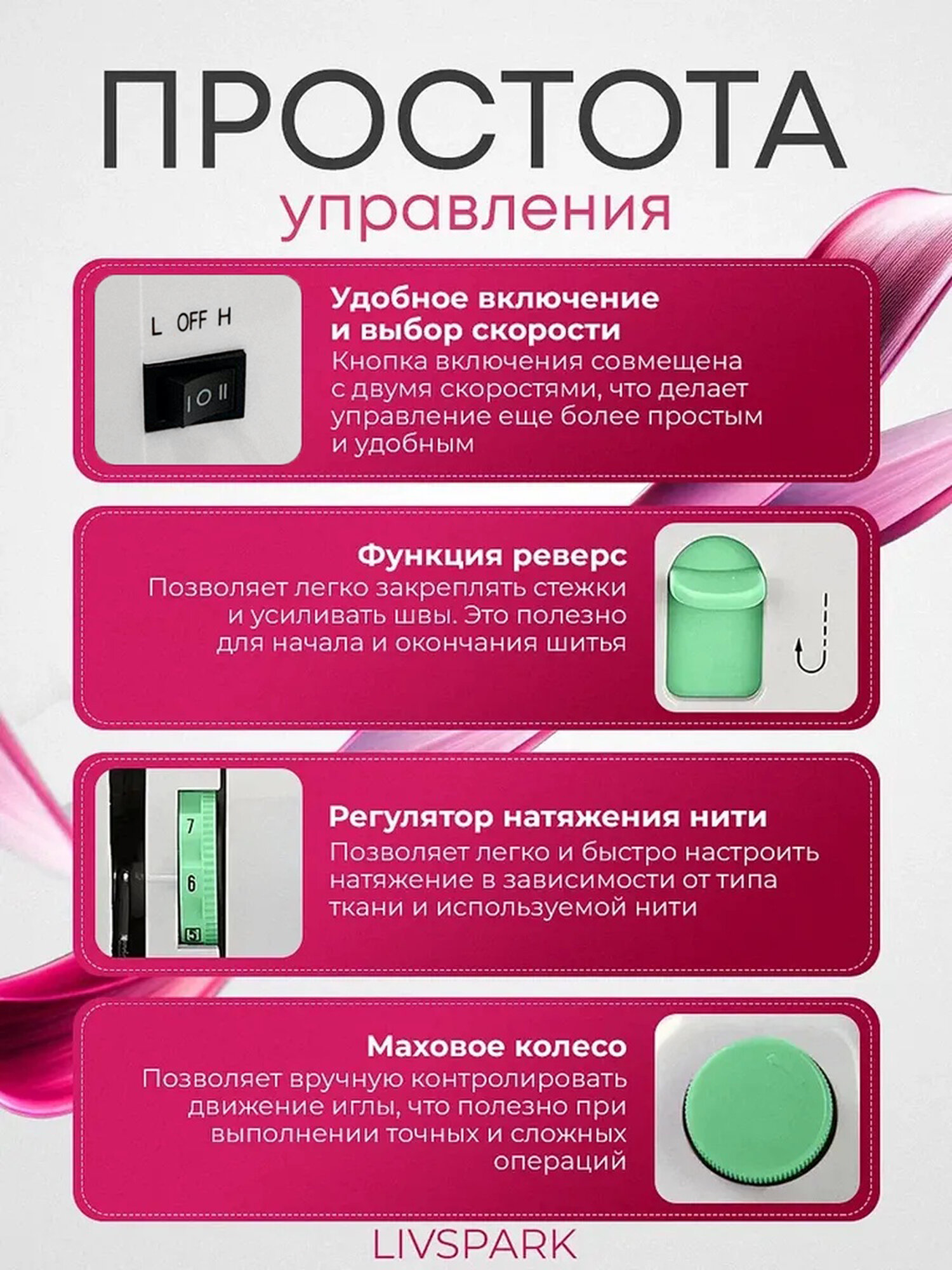 | Регулировка скорости шитья | ступенчатая |