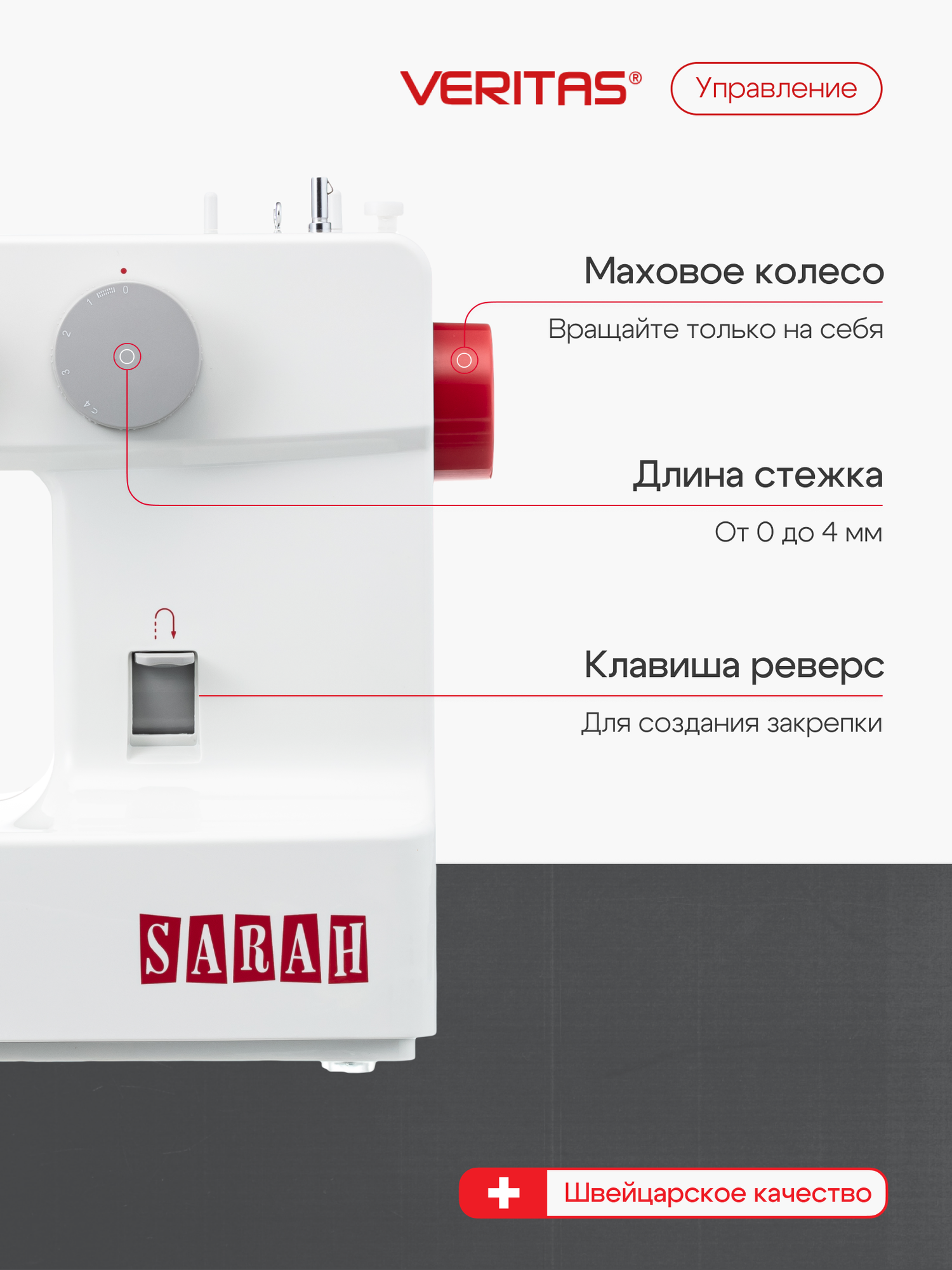 Электромеханическая швейная машинка VERITAS SARAH (Сара) с вертикальным челноком порадует качественным функционалом и минималистичным дизайном корпуса, и станет незаменимым помощником в воплощении ваших творческих идей. Машина VERITAS SARAH обладает оптимальным набором функций, имеет рычаг обратного хода для выполнения закрепки или штопки и выполняет петлю в полуавтоматическом режиме. 13 швейных операций, включая декоративные стежки и вымётывание петель за 4 шага, выбираются регулятором. На панель машины нанесены пошаговые схемы намотки нити на шпульку и заправки верхней нити. На машинке VERITAS SARAH можно прошивать широкий диапазон ткани: от шифона до джинсы. Возможно вшивание молний. Дополнительный подъём лапки позволит шить многослойные изделия. Узкие детали удобно проработать с помощью съемной рукавной панели. Продукция VERITAS зарекомендовала себя как долговечная швейная техника: машинка простая в освоении и надежна в эксплуатации. Широкая комплектация аксессуаров позволит обойтись без дополнительных покупок, ведь в машинке уже заложены все инструменты, чтобы с комфортом приступить к творческим проектам. Швейная машинка VERITAS SARAH – это оптимальный выбор как для новичка, так и для профессионала в сфере шитья.