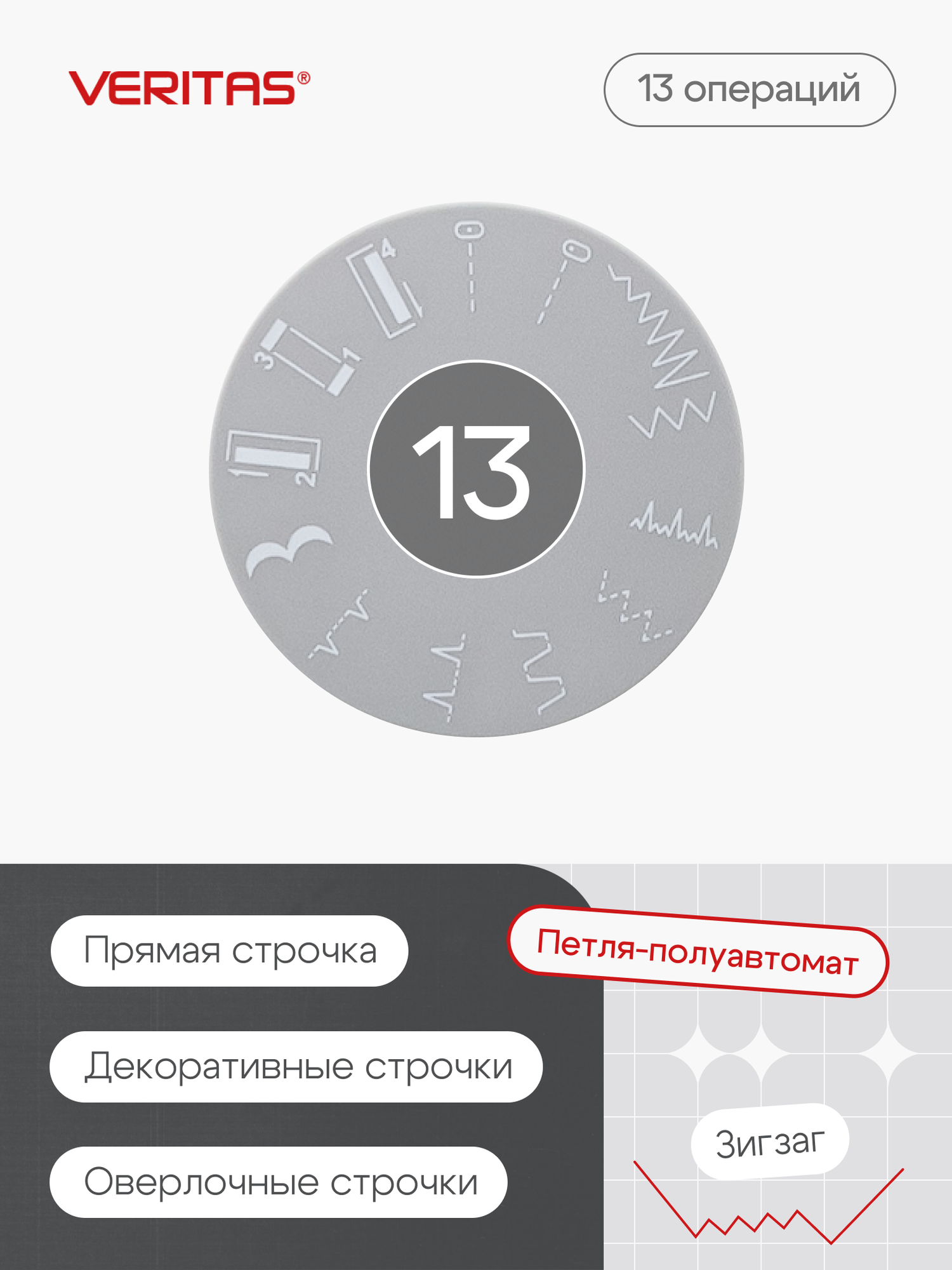 - 13 швейных операций: прямая строчка (центральное и правое положение иглы), зигзаг, декоративные строчки, оверлочные строчки, петля-полуавтомат