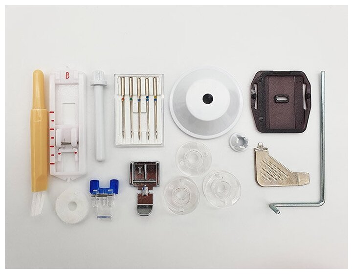 | Подробная комплектация | Универсальная лапка Рамка для полуавтоматической петли Лапка для вшивания молнии Лапка для пришивания пуговиц Штопальная пластина Направитель для квилтинга Шпульки Держатель катушки большой Держатель катушки малый Вертикальный катушечный стержень Фетровая прокладка Вспарыватель/щёточка для чистки пыли Набор игл Отвёртка-ключ Педаль |