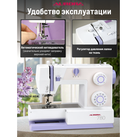 Особенностью Aurora 780 является возможность работы с грубыми и тонкими тканями, а также система измерения размера пуговиц. Максимальная длина стежка составляет 4 мм, а максимальная ширина строчки - 6 мм.
