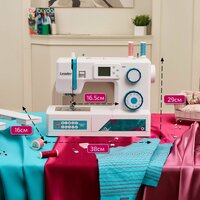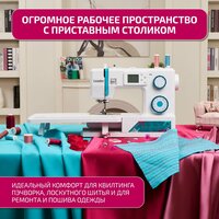 35 швейных операций, в число которых входят декоративные строчки, петли – автомат а также современная 7-сегментная зубчатая рейка – транспортёра, надежно обеспечивает продвижение лёгких и эластичных тканей. Встроенный нитевдеватель, кнопка реверс – закрепка, позиционирование иглы, клавиша Старт/Стоп, регулировка скорости на панели машины, функция шитья двойной иглой, строчки алфавита, всё это есть в спецификации машины. Leader Lazurite комфортно работает с любой плотностью тканей, в машине усиленный прокол иглы, максимальный подъём лапки – 12 мм. Дополнительный столик в комплекте машины подойдет для реализации больших проектов, а большой комплект аксессуаров позволит стартовать без дополнительных затрат.