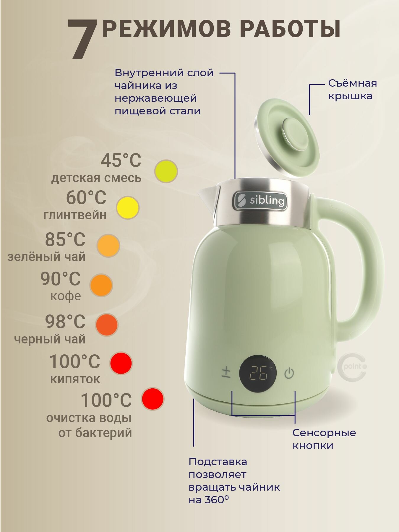 | Особенности | бесшумное закипание, вращение на 360 градусов, двойные стенки, дисплей, индикатор уровня воды, индикация включения, сенсорное управление |