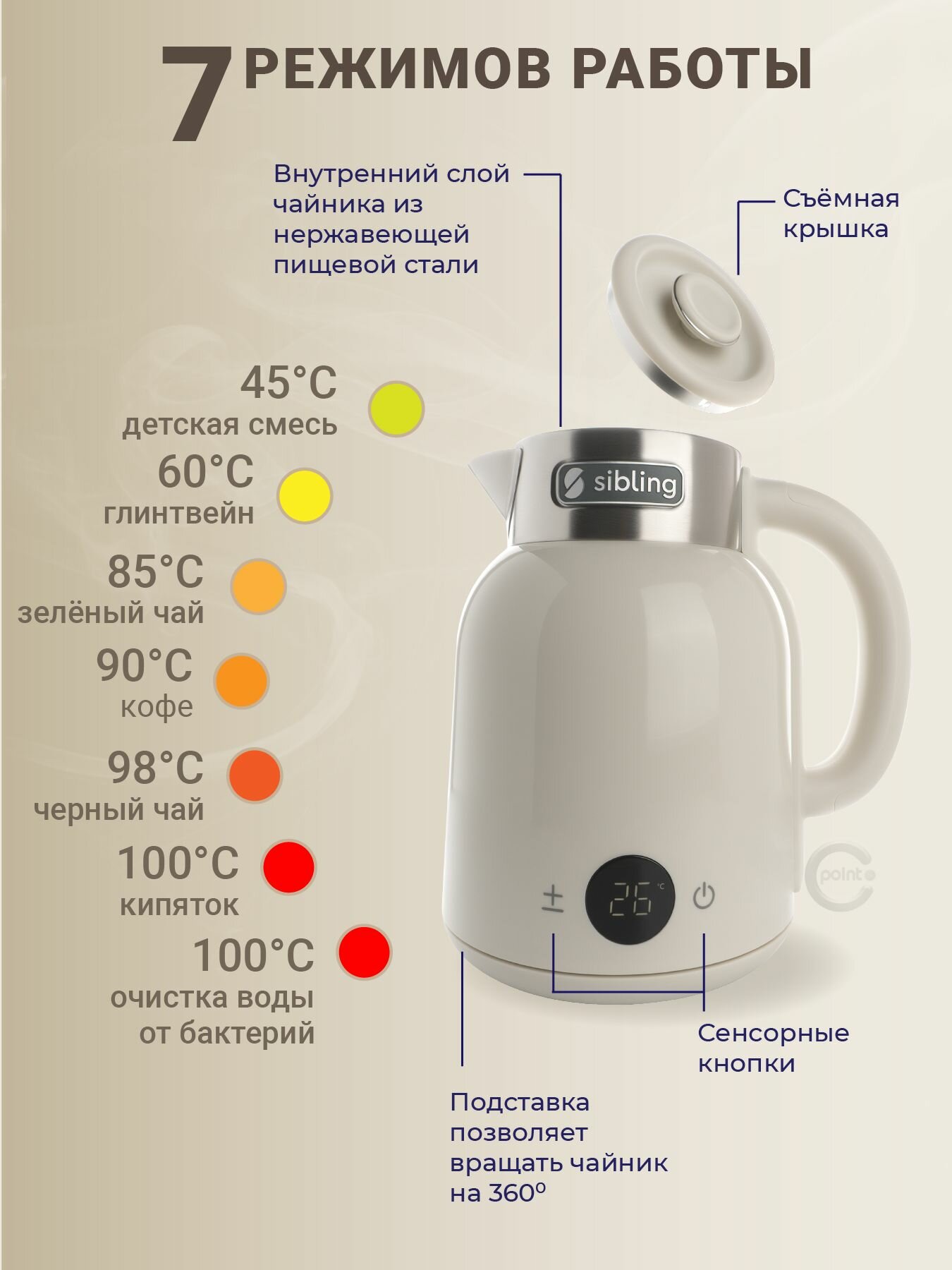 | Особенности | бесшумное закипание, вращение на 360 градусов, двойные стенки, дисплей, индикатор уровня воды, индикация включения, сенсорное управление |