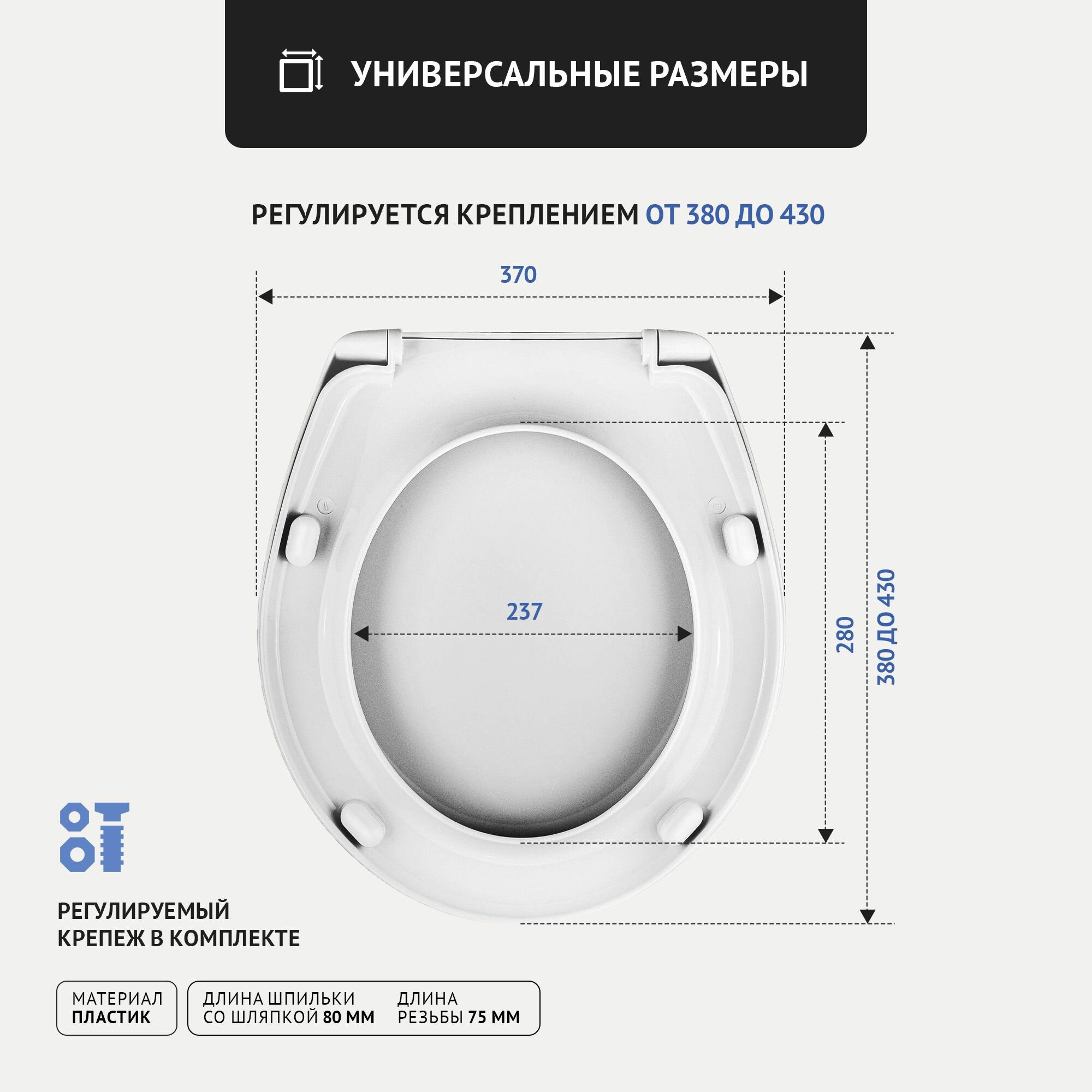 Белое сиденье Zota PP выполнено из материала полипропилен: он долговечен, пластичен, благодаря чему устойчив к нагрузкам и прост в уходе. Полипропилен имеет гладкую поверхность и глянцевый блеск. Часто в покрытие стульчаков из пластмассы добавляют антибактериальные компоненты, благодаря которым повышается гигиеничность при использовании изделия. Крышка для унитаза из полипропилена более дешевая, нежели стульчак из дюропласта. Ободок из полипропилена является теплым за счет теплообмена, из-за которого не возникает дискомфортных ощущений при соприкосновении кожи с холодным сиденьем унитаза, поэтому чехол или накладка не потребуются. Наш товар для дома подойдет и для подвесного унитаза, и для напольного с внешним бачком. Крышка на туалет Zota PP имеет классическую лаконичную форму, которая успешно завершит образ вашей туалетной комнаты, также подойдет для уличного туалета на даче. У сидушки нет функций микролифта и быстросъема. Пластиковое сиденье имеет в комплекте универсальные крепления из полипропилена. Регулировка общей длины крышки на унитаз: 380-430 мм. Регулировка креплений: 154-159 мм. Ширина аксессуара для дома составляет 370 мм. Внутреннее кольцо имеет длину 280 мм, ширину 237 мм. (подходит для взрослых и детей, приученных к туалету). Домашнее сиденье Zota PP совместимо с унитазами: Cersanit: Delfi; Colombo: Венеция, Коломбо, Полиссия, Элегант, Эпика; Gustavsberg: Basic; IDDIS: Iceberg; IFO: Fargen; INKER: Valentina; Jika: Lyra, Vega, Zeta; KERAMIN: Гранд, Лидер; ROSA: Лира, Неро, Поло, Ресса; SANTEK: Анимо, Бореаль, Цезарь; Santeri: Орион, Ультра Каждый товар перед отправкой внимательно проверяется на целостность и исправность.