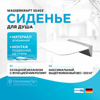 Сиденье для душа WasserKRAFT SS403 Сиденья для душа предназначены для того, чтобы наполнить удобством и комфортом зону душа. Это изделие понравится всем членам семьи. Всегда можно будет сесть и расслабиться, наслаждаясь моментом водных процедур. Если это не требуется, сиденье можно сложить к стене. Для пожилых людей это может стать необходимым аксессуаром, позволяя отдыхать ногам.