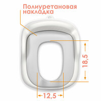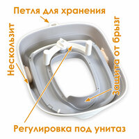 Мягкая полиуретановая накладка на сиденье легко вынимается и моется отдельно. Специальный материал основания сиденья предотвращают скольжение на любом унитазе. Надежная защита от брызг (выступающая часть спереди) одинаково подходит как девочкам, так и мальчикам. Специальный механизм позволяет зафиксировать сиденье на унитазе практически любой формы и размера. Удобные ручки по бокам помогут малышу чувствовать устойчиво. Мягкий пластик спинки и боковой поддержки - для большего комфорта.