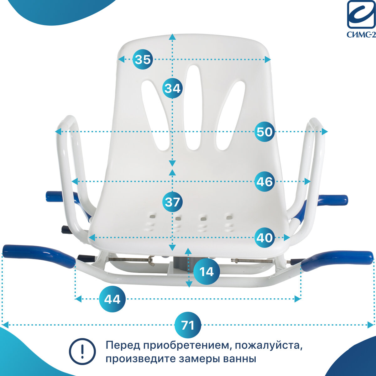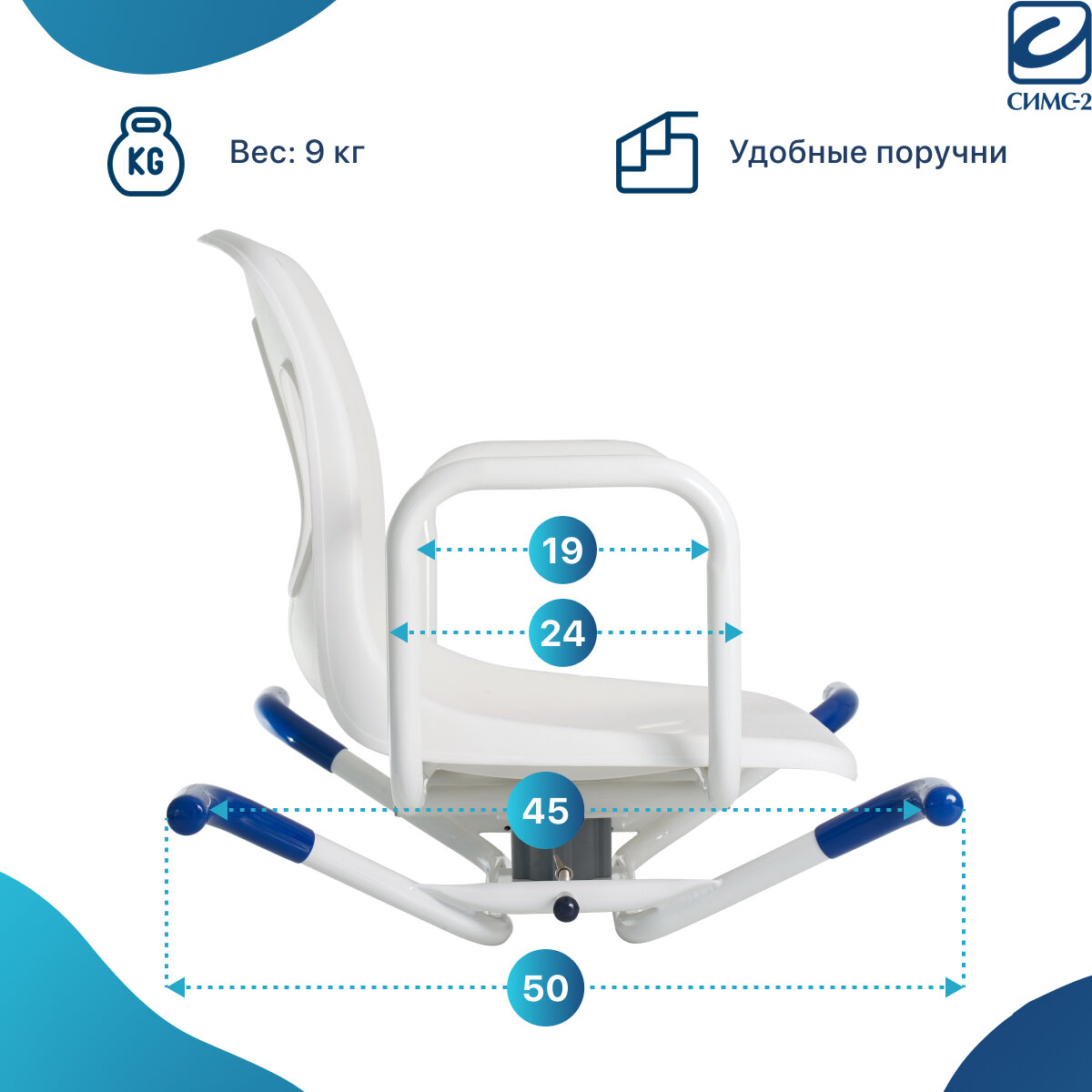Сиденье снабжено поворотным механизмом, с помощью которого можно развернуть его на 90 градусов. Такой механизм делает использование сиденья еще легче и безопаснее: для того чтобы сесть, нужно будет повернуть сиденье к себе, сесть, приподнять ноги и развернуться в ванну. Усилий потребуется еще меньше, чем с обычными сиденьями. Есть фиксаторы положения, которые предотвратят спонтанные повороты кресла.