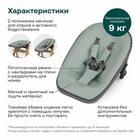 Newborn имеет 2 положения наклона: более горизонтальное для отдыха и менее горизонтальное для активного бодрствования. Пятиточечные ремни с мягкими наладками обеспечат безопасность для ребенка. Тканевая обивка сиденья из 100% полиэстера легко крепится с помощью липучек, если она запачкается, ее просто снять и постирать.