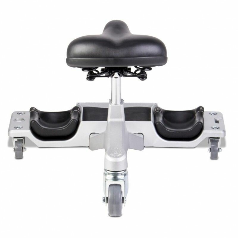 Эргономичное сиденье имеет прочное алюминиевое шасси, улучшенной стабильности, регулируется по высоте и наклону и легко адаптируется под конкретного пользователя и вид работы, прочная конструкция с 7 резиновыми колёсами высокой прочности обеспечивает отличную манёвренность на любой поверхности, оснащено удобным поддоном, которые используются при напольных работах, сменные эргономичные наколенники, хорошо выверенная конструкция обеспечивает профессионалу удобство работы и экономит его силы, предотвращает профессиональные заболевания колен и спины, максимальная нагрузка на сидение 130 кг.