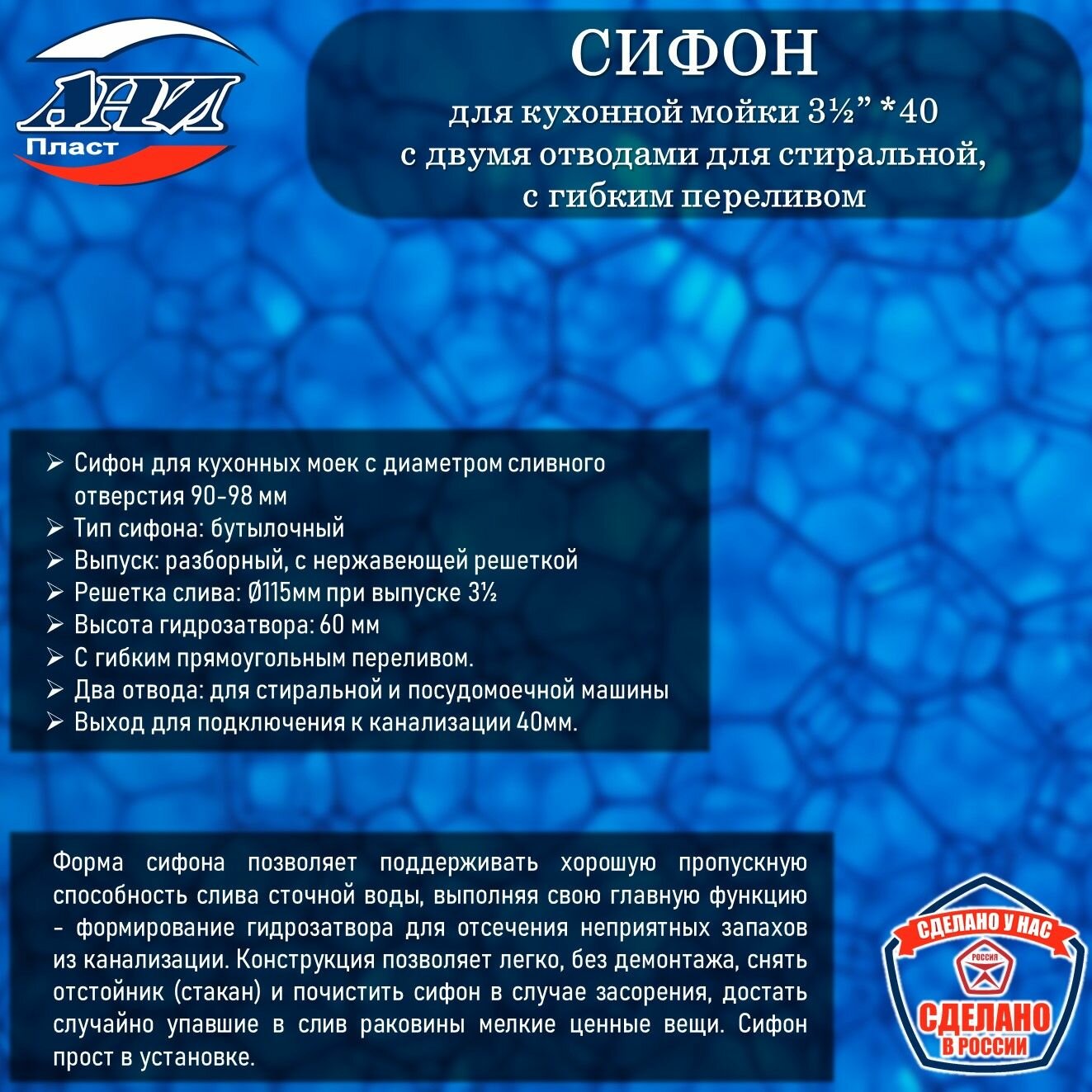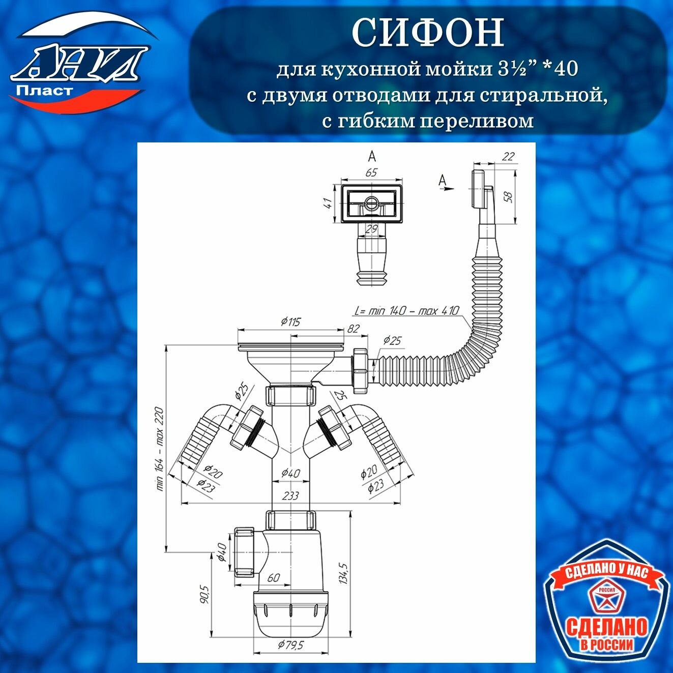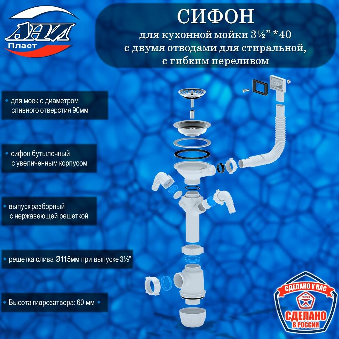 Сифон АНИ Пласт А0146S Грот 3 1/2″ х 40 для кухонной мойки с 2-мя отводами для стир. машины, с гибким переливом: сравнение цен, характеристики, фото, актуальное наличие и цены.