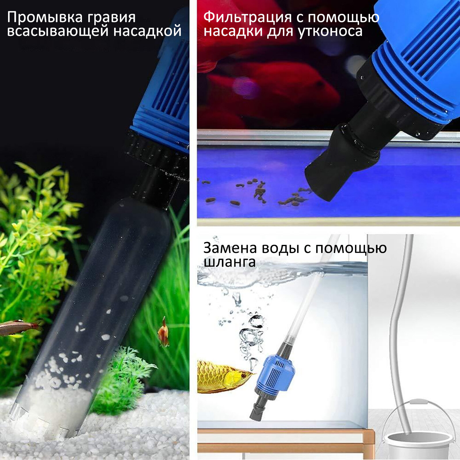 [Многофункциональность для полной очистки]: 3 функции для различной очистки; Промывка гравия с помощью всасывающей насадки, замена воды с помощью шланга или фильтрация отходов из аквариума с помощью насадки для утконоса; Удовлетворяет большинству требований по очистке аквариума.
