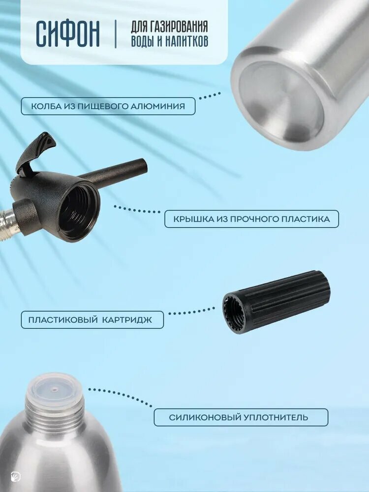 | Подробная комплектация | Сифон для газирования воды - 1 шт; Баллончики СО2 - 5 шт; Картридж для баллончика - 1 шт; Съёмник для клапана - 1 шт; |