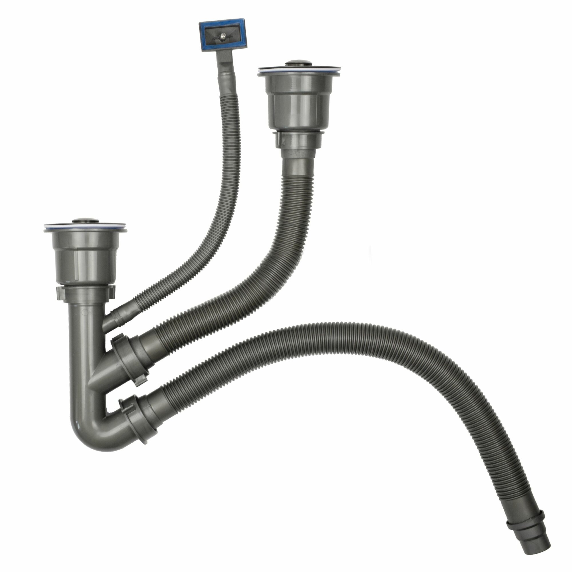Сифон для мойки двойной с переливом верхняя часть графит - это идеальный выбор для тех, кто ценит комфорт и удобство во время использования кухонной мойки. Сифон имеет диаметр сливного отверстия 90 мм, глубокие горловины и коленный тип, что обеспечивает хорошую пропускную способность и формирование гидрозатвора. Горловины оснащены съемными корзинами для мусора, которые позволяют легко удалять отходы из раковины. Конструкция сифона проста в установке, позволяет легко снимать отстойник и чистить его в случае засорения. Сифон выполнен из высококачественного пластика ABS с гидрозатвором, предотвращающим проникновение запахов из канализации. Благодаря всем этим преимуществам, наш сифон станет незаменимым помощником на вашей кухне. Он поможет поддерживать чистоту и порядок, а также обеспечит комфорт и удобство при использовании кухонной мойки. Диаметр верхней чаши 110 мм, высота чаш слива 100 мм, высота колена 230 мм, верхняя гофра 400 мм, нижняя гофра 600 мм, гофра перелива 450 мм, перелив 65х40 мм. Сливной диаметр 40мм