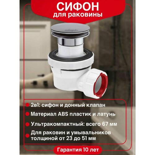 - Ультракомпактный: всего 67 мм, сифон практически не видим, освобождает пространство под раковиной