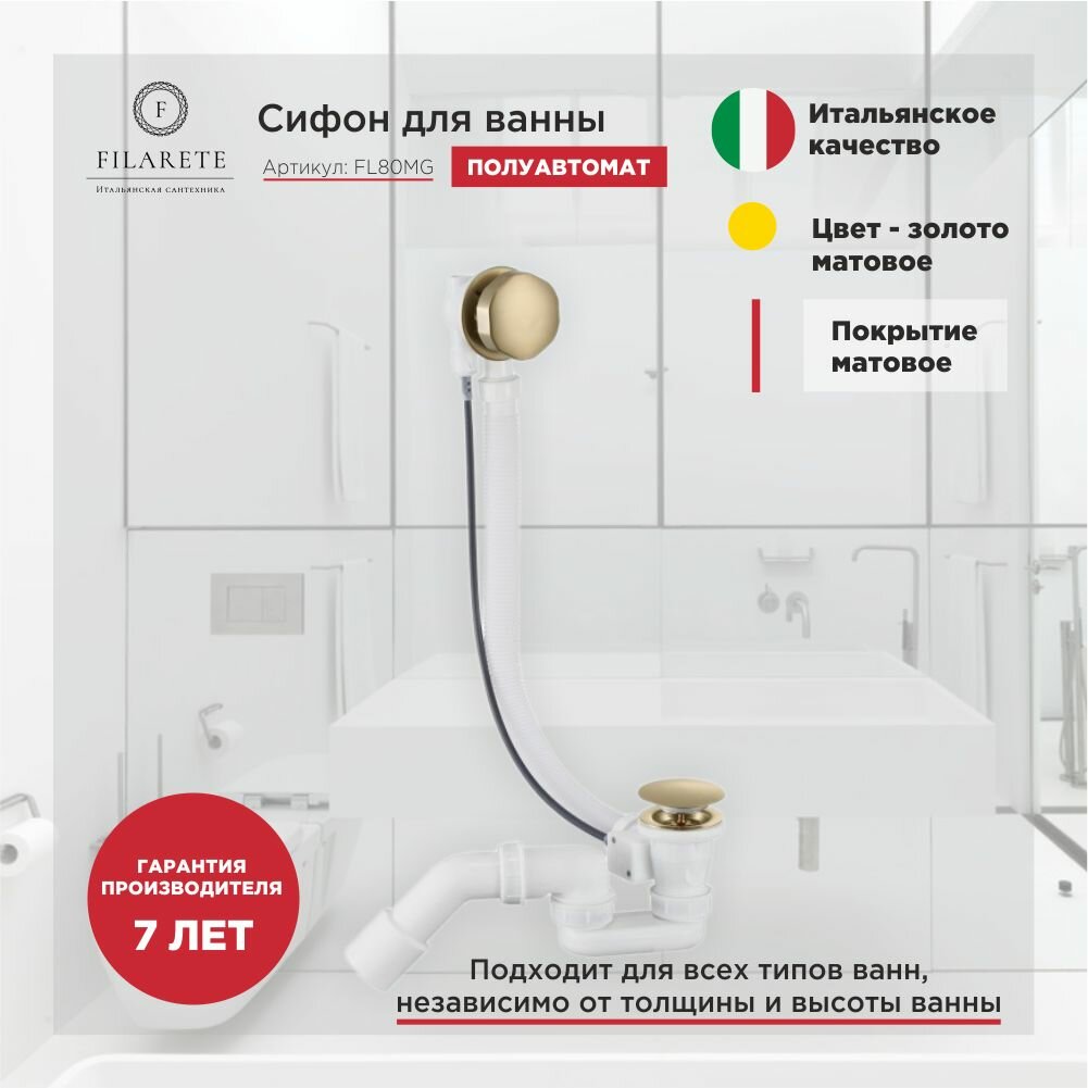 Сифон для ванны полуавтоматический FILARETE FL80 (Матовое золото) - это высококачественный продукт, который сочетает в себе функциональность и эстетику.