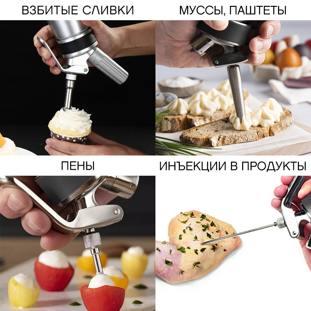 Что можно делать в кремере-сифоне: взбитые сливки, пены, муссы, легкие паштеты, супы, нитро-кофе, быстро мариновать фрукты и овощи, инфузировать (насыщать) вкусы в алкогольные напитки, газировать домашние лимонады.