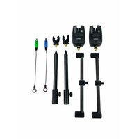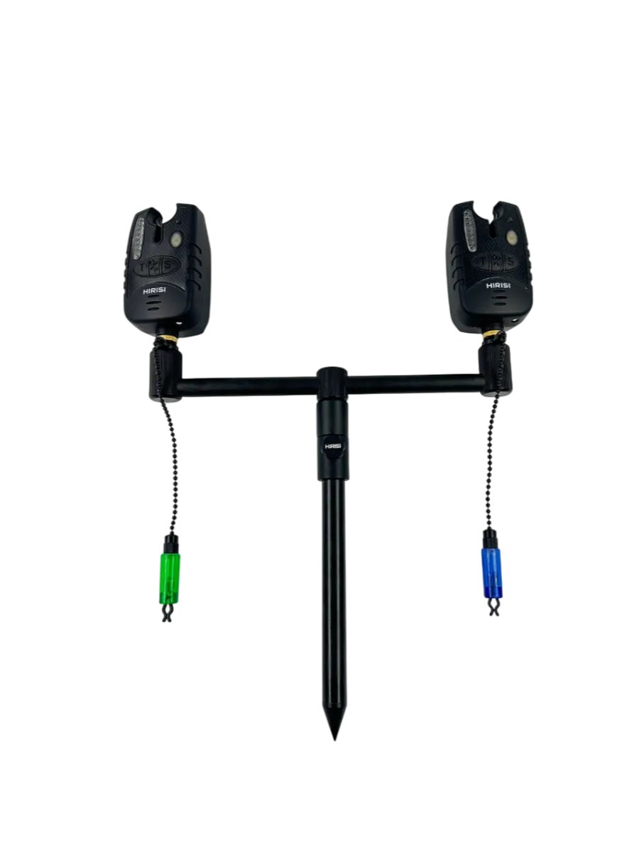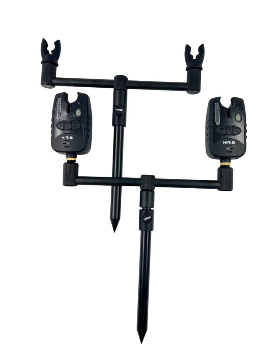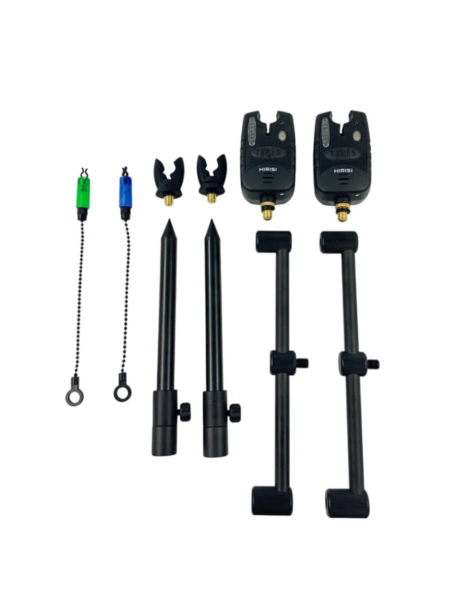 Беспроводные сигнализаторы клева HIRISI для карповой ловли и фидера в комплекте со свингерами для рыбалки в сумке для переноски. Набор состоит из 2-х электронных сигнализаторов поклевки, подставок стоек буз бар (buzz bar) под 2 удилища, а также светодиодных индикаторов клева, которые предназначены для ловли рыбы на несколько удочек и устанавливаются на рыболовную снасть. Датчики клева оснащены резьбой для их крепления на подставку под удочку или род под, световым и звуковым видами оповещения. Детекторы поклевки фидерные имеют широкий функционал и влагозащитный корпус, при этом не займут много места в Вашем рыболовном снаряжении. Элемент питания сигнализатора – батарейка типа крона 9V. Отличное приобретение для каждого рыболова, который ценит свой комфорт, а также превосходный подарок рыбаку на день рождения, новый год, 23 февраля.