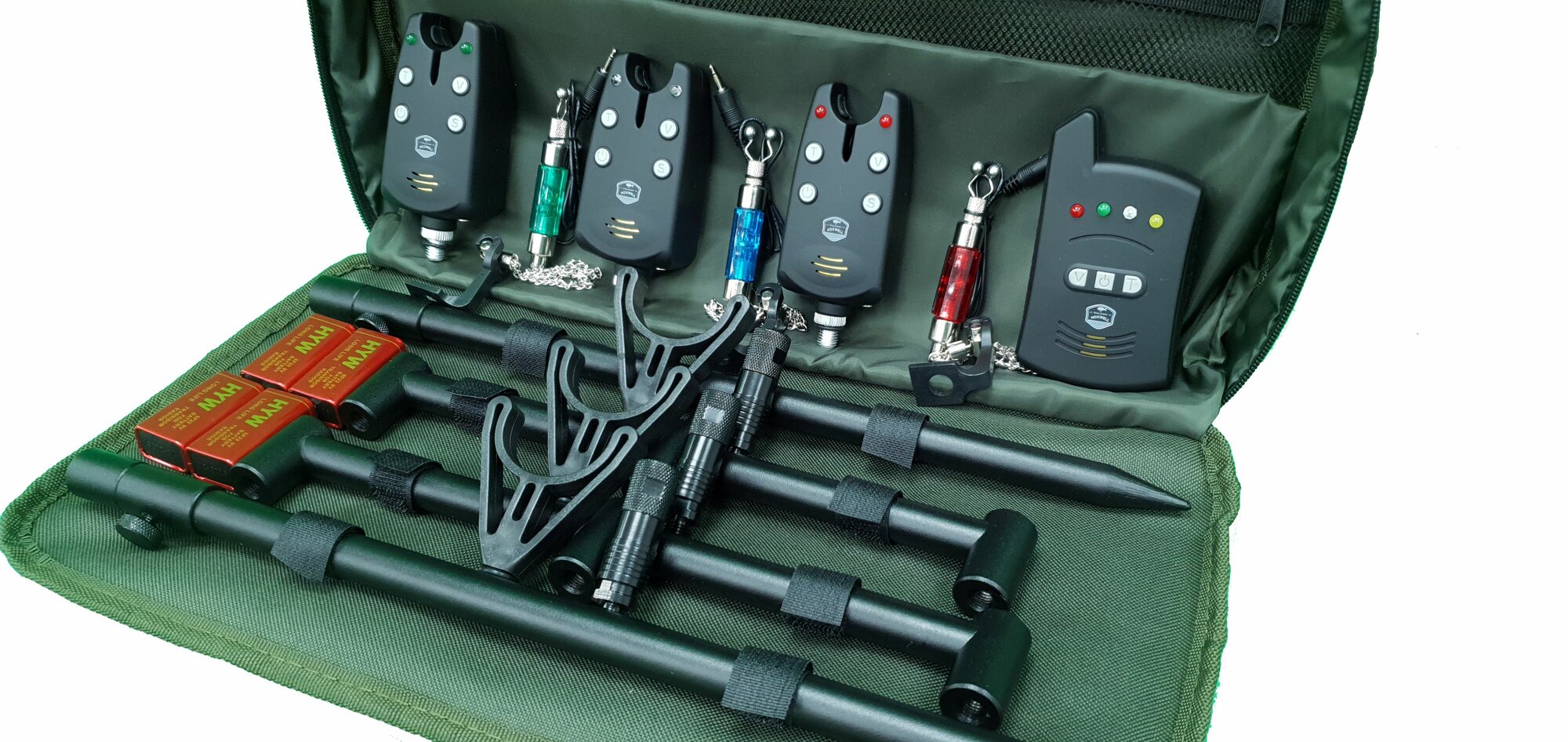 В комплекте имеется мягкий удобный кейс для хранения и переноски, который защищает лучше пластикового и при этом сам не ломается. Пейджер и сигнализатор имеют: изменение тональности звукового сигнала относительно направления поклевки(от берега или к берегу) и изменение цвета светового индикатора на них и сигнализируют о поклевке еще 20 сек. после ее осуществления.