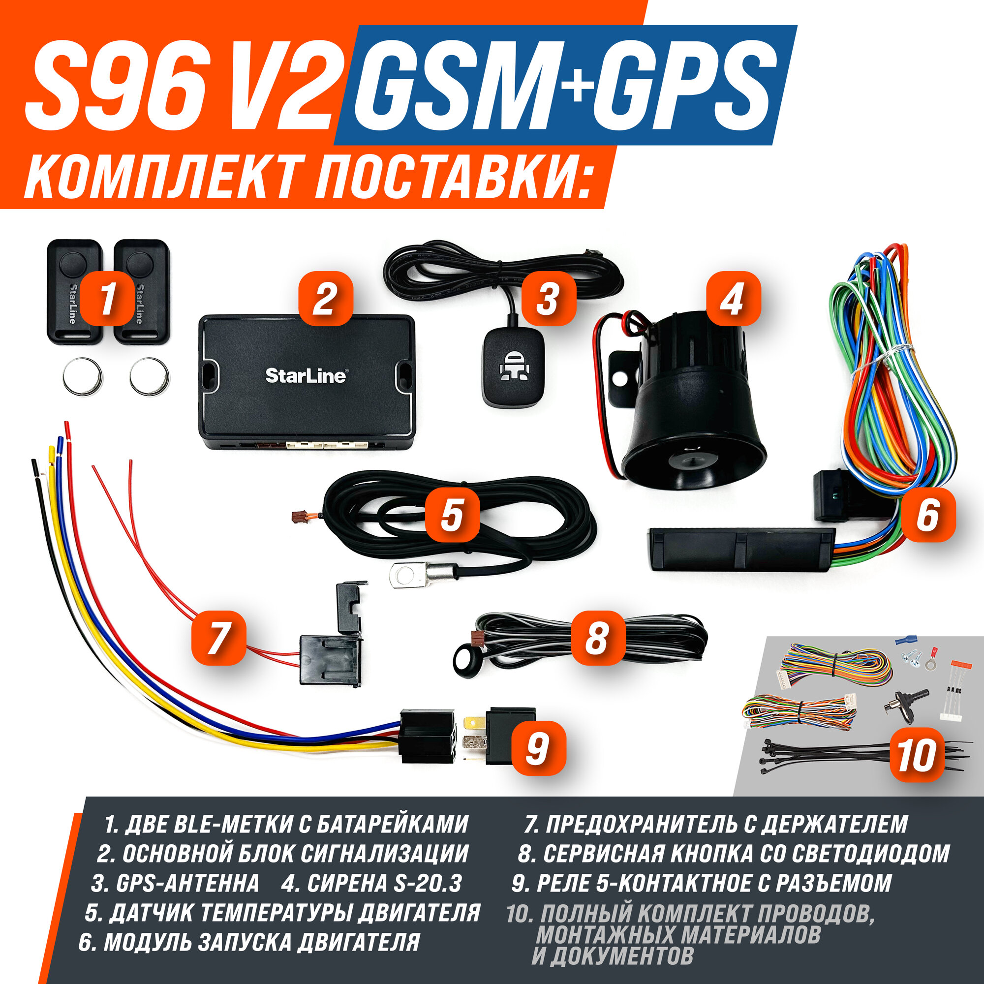 | Подробная комплектация | Основной блок, Брелок-метка (2 шт.), Навигационный модуль с ГЛОНАСС+GPS-антенной, Модуль запуска двигателя, Датчик температуры двигателя, Кнопка со светодиодом, Предохранитель с держателем, Реле 5-контактное с разъемом, Сирена S-20.3 |