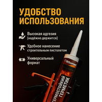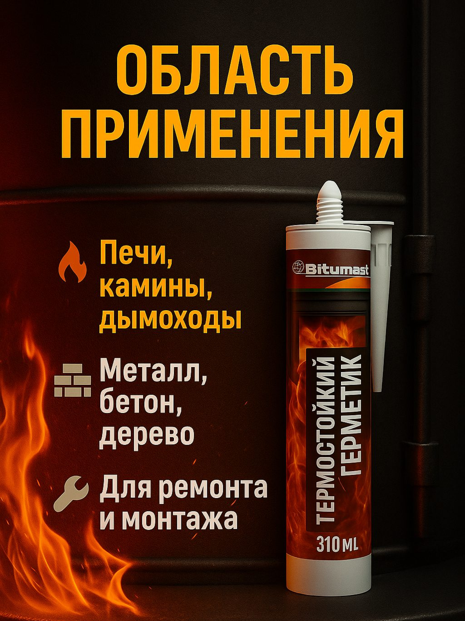 Силикатный термостойкий герметик Bitumast 310 мл, 500 г 4607952907942 используется для герметизации мест примыканий на бетонных, деревянных и металлических поверхностях; для ремонта строительных элементов, подверженных воздействию огня и повышенной температуры; для герметизации дымоходов.