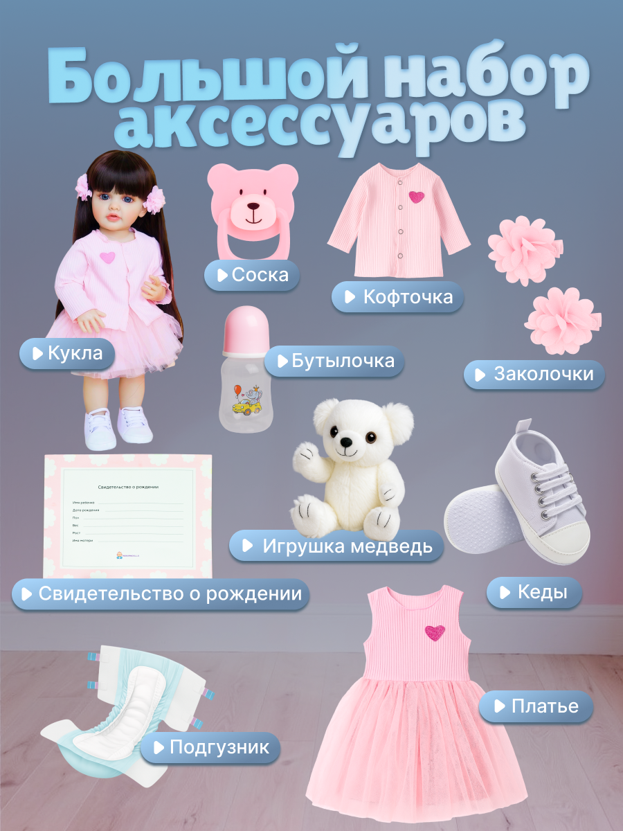 Детализация 3D real включает мельчайшие особенности кожи, такие как вены, капилляры, мраморный оттенок, покраснения, складочки и ноготочки. Это делает куклу максимально похожей на настоящего младенца. Её можно наряжать, укладывать в кроватку и использовать аксессуары для ухода, что подходит как для коллекционирования, так и для сюжетных игр.