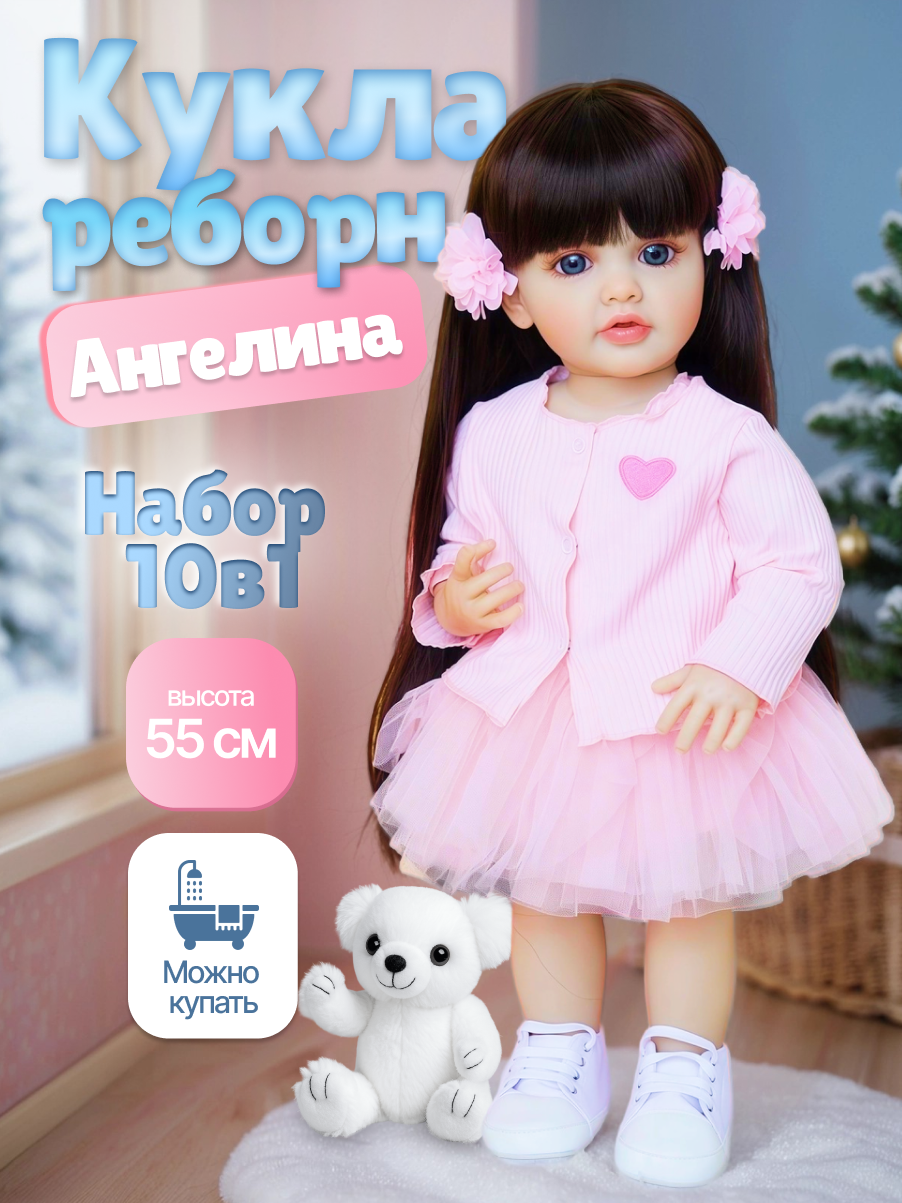 Силиконовая кукла Реборн Ангелина – это реалистичная девочка-младенец с проработанными деталями, создающими эффект настоящего ребёнка. Её рост составляет 55 см, а тело полностью выполнено из мягкого силиконового материала, что делает прикосновения куклы приятными и естественными. Благодаря гибким пальчикам можно менять положение рук и придавать кукле различные позы.