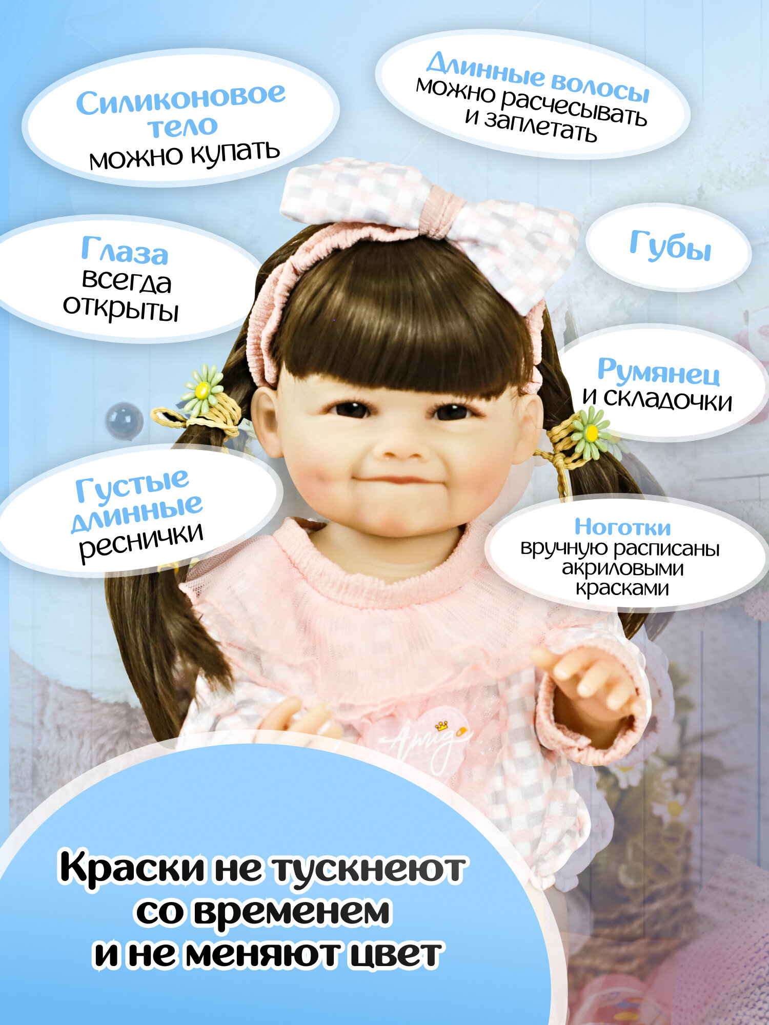 Силиконовая кукла Реборн девочка Лиана, 42 см — реалистичная кукла с полным силиконовым телом для игр, купания и переодеваний. Изготовлена из приятного на ощупь, гипоаллергенного винил-силикона, безопасного для детей. Благодаря подвижным ручкам и ножкам, кукле можно придавать разные позы. Подходит для переодеваний — размеры соответствуют настоящей одежде для новорождённых. Глаза у куклы открытые, не закрываются. Отличный подарок для ребёнка и коллекционера.