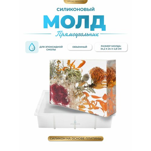 Силиконовый молд (SM259) - Объемный прямоугольник от Эпоксимастер позволит вам сделать объемную заливку из эпоксидной смолы. Молд имеет идеально ровную и глянцевую поверхность - вы просто заливаете его эпоксидной смолой и получаете потрясающее изделие ручной работы! Молд изготовлен из пищевого силикона на основе платины. Силиконовый молд многоразовый: после использования промойте теплой водой (избегайте использования моющих средств и губок, чтобы не повредить глянцевую поверхность). Для заливки молда рекомендуется использовать смолу для рисования средней вязкости или жидкую. Перед заливкой убедитесь, что поверхность, на которой лежит молд, ровная. Края изделия часто покрывают жидкой поталью, что придает ему более благородный и премиальный вид. Размер молда: 34,2 x 24 x 4,8 см
