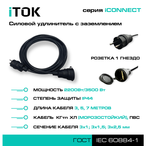 Купить Силовой удлинитель с заземлением серии iCONNECT ПВС 3х1 мм 1 гнездо IP44 ГОСТ 3 м iTOK с доставкой по всей России. Силовой удлинитель с заземлением серии iCONNECT ПВС 3х1 мм 1 гнездо IP44 ГОСТ 3 м iTOK: сравнение цен, характеристики, фото, актуальное наличие и цены.