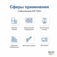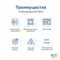 В стабилизаторах SMARTWATT серии TRIAC в качестве ключей переключения используются симисторы (симметричные триодные тиристоры). Симисторные стабилизаторы отличаются бесшумным переключением обмоток, отсутствием искрений при переключении, увеличенной скоростью переключений, долгим сроком службы.