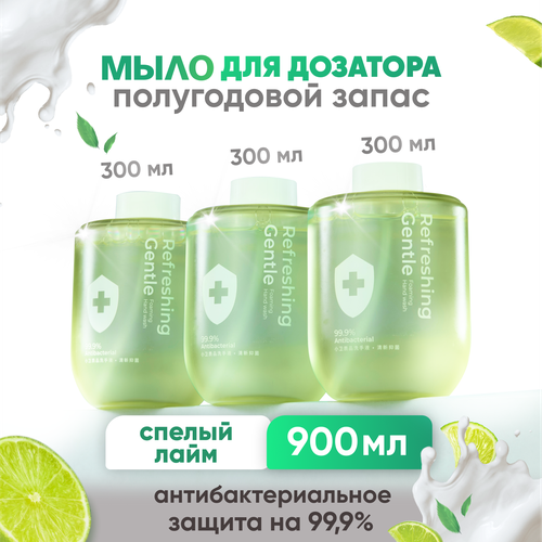 В комплекте с мылом идут три сменных блока по 300 мл каждый. Они предназначены для использования в сенсорных диспенсерах. Благодаря тому, что мыло вспенивается внутри дозатора, поверхность сантехники остается сухой и чистой.