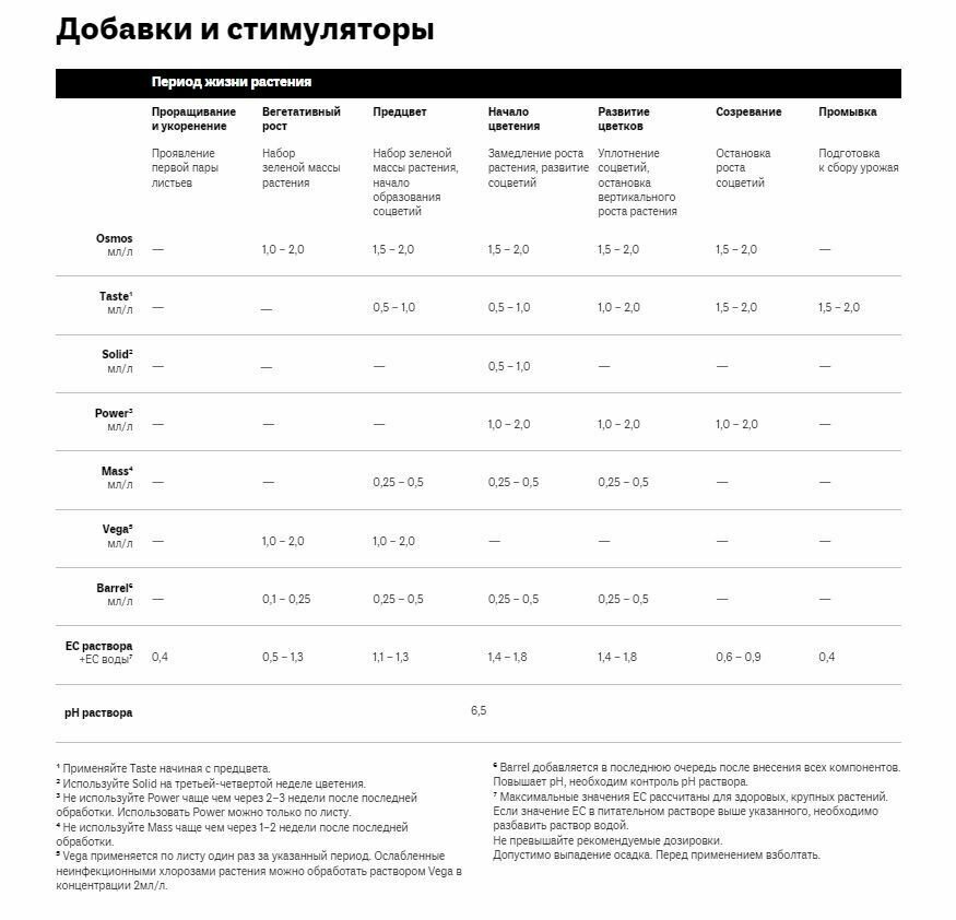 Для приготовления раствора добавьте 0,5-1 мл/л раствора во время набора зеленой массы и развития соцветий.
