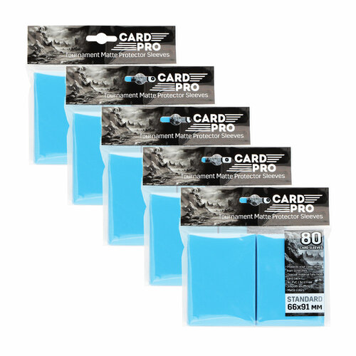 В наборе 5 упаковок по 80 матовых протекторов Card-Pro размером 66х91мм. Протекторы подходят для большинства коллекционных карточных игр. Одной пачкой протекторов вы сможете "нарядить" всю колоду, включая сайдборд, и у вас останется 5 протекторов "про запас".