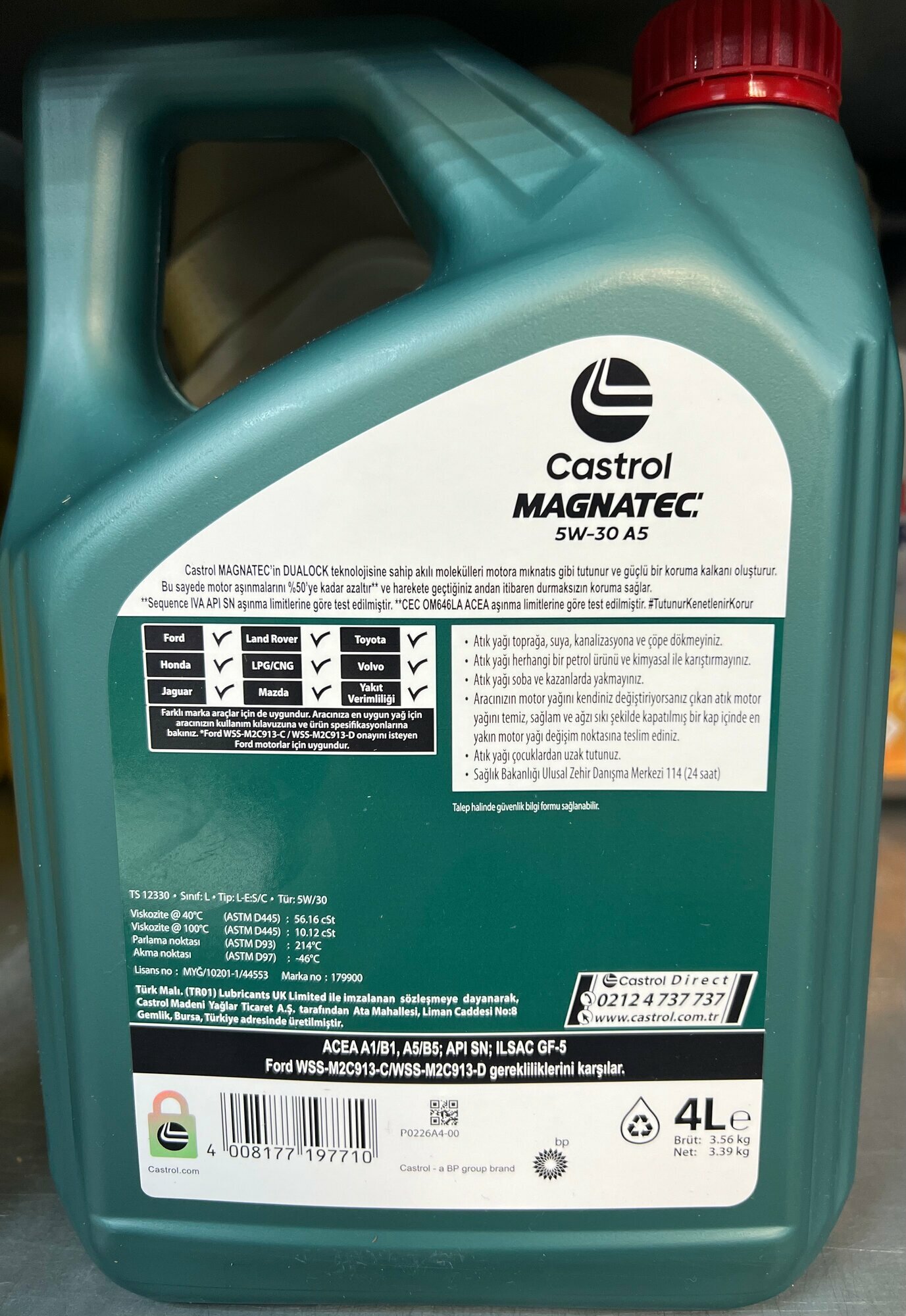 Моторное масло Castrol Magnatec 5W-30 A5 . Моторное масло Castrol Magnatec 5W-30 A5 предназначено для бензиновых и дизельных двигателей автомобилей, в которых производитель рекомендует использовать смазочные материалы класса вязкости SAE 5W-30, спецификаций ACEA A5/B5, A1/B1, API SN/CF ILSAC GF-4 или более ранних. Castrol Magnatec 5W-30 A5 подходит для применения в двигателях автомобилей Ford, требующих моторные масла спецификаций Ford WSS-M2C913-D, Ford WSS-M2C913-C, Ford WSS-M2C913-B или Ford WSS-M2C913-A. Преимущества: . удерживаются на важнейших деталях двигателя, когда обычное масло стекает в поддон картера; притягиваются к деталям двигателя, образуя устойчивый защитный слой, сохраняющийся с первой секунды работы двигателя вплоть до следующего пуска; сцепляются с металлическими поверхностями деталей двигателя, делая их более устойчивыми к изнашиванию; в сочетании с синтетической технологией обеспечивают повышенную защиту при высоко- и низкотемпературных режимах работы двигателя; обеспечивают постоянную защиту в любых условиях эксплуатации, при различных стилях вождения и в широком диапазоне температур. Спецификации: . ACEA A1/B1, A5/B5 API SN/CF ILSAC GF-4 Meets Ford WSS-M2C913-A / Ford WSS-M2C913-B / Ford WSS-M2C913-C / Ford WSS-M2C913-D Характеристики . Плотность при 15°C, г/мл 0,84 Кинематическая вязкость при 100°C, мм 2 /с 9,6 Кинематическая вязкость при 40°C, мм 2 /с 54 Индекс вязкости 164 Динамическая вязкость, CCS при -30°С, мПа·с (сП) 4580 Температура застывания, °C -39 Температура вспышки (PMCC), °C 207 Сульфатная зольность, % масс. 1,24