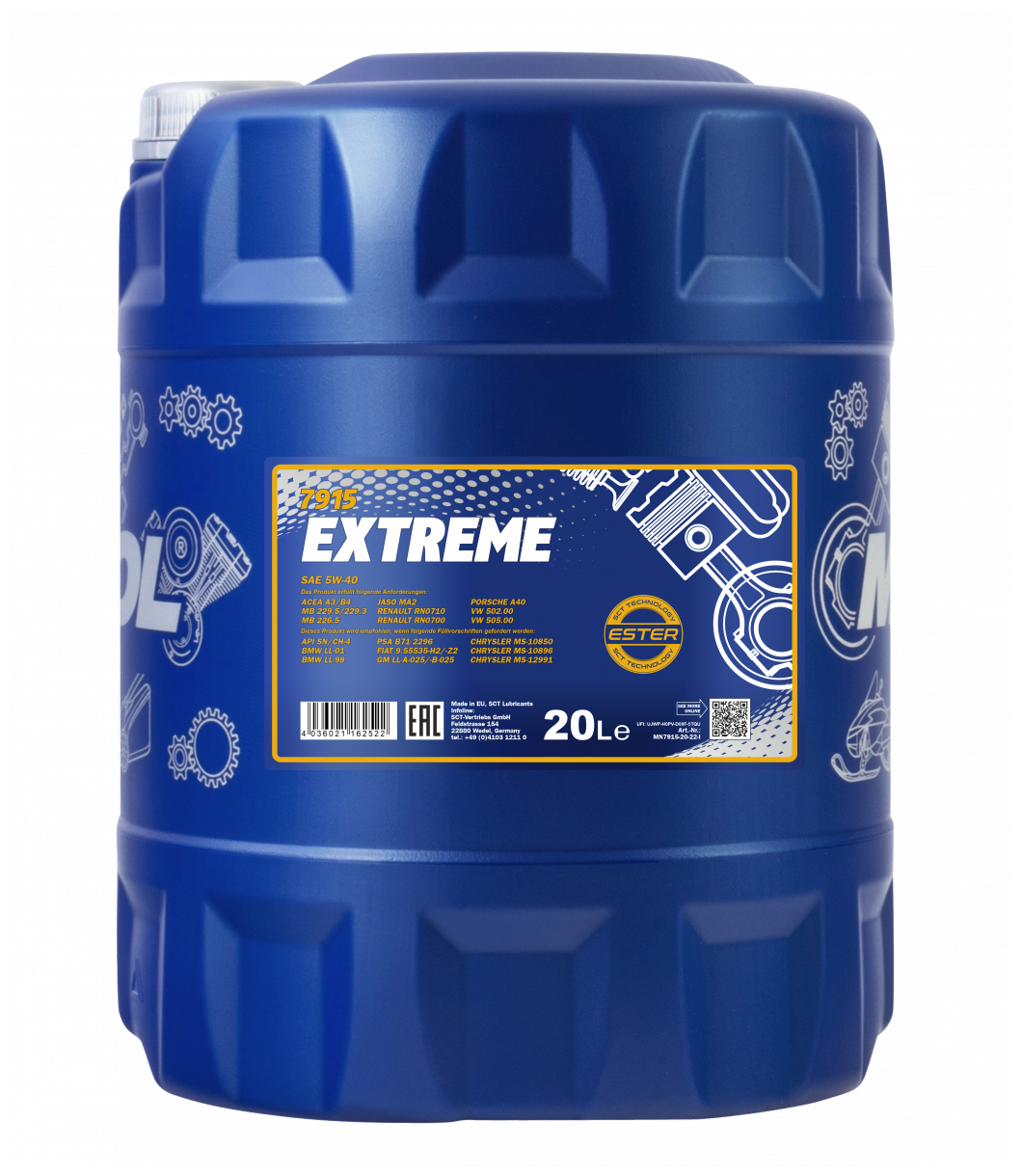 Инновационное универсальное ester-содержащее полностью синтетическое моторное масло премиум-класса для современных бензиновых и дизельных двигателей с турбонаддувом и без, в том числе «старых» марок и с большим пробегом. Разработано на основании требований европейских товаропроизводителей. Свойства продукта:- Ester-технология и синтетическая основа с расширенным диапазоном вязкостно-температурных свойств обеспечивает эффективную эксплуатацию двигателя на всех режимах работы: при холодном пуске, в городском режиме, в режиме трассы, а также при повышенной нагрузке (при езде по бездорожью, в гору, движении с прицепом, максимальной загрузке) и при высоких температурах окружающей среды;- Отлично подходит для активной езды и не теряет своих свойств при применении топлива переменного качества (с содержанием серы до 500 ppm) за счёт большого запаса щелочного числа (TBN);- Синтетическая ester-содержащая основа в сочетании современным пакетом присадок сохраняет мощностные параметры двигателя на протяжении всего интервала между заменами;- Эстеровые компоненты масла обеспечивают отличные противоизносные и антифрикционные свойства за счёт исключительной прочности масляной плёнки, что в сочетании с превосходной прокачиваемостью значительно увеличивает срок службы двигателя даже в режимах движения " Start-stop" и при холодном пуске;- За счет превосходных моюще-диспергирующих свойств и высочайшей термоокислительной стабильности эффективно борется со всеми видами отложений и поддерживает в чистоте детали двигателя на протяжении всего интервала между заменами;- Применяется в двигателях с увеличенным интервалом замены масла (Long Life) и обычных;- Применимо для 4T двигателей мотоциклов с «мокрым» сцеплением. Предназначено для бензиновых и дизельных двигателей широкого парка автомобилей (легковых, легких внедорожников, микроавтобусов и легких грузовиков) европейских и других производителей. Рекомендовано для применения в двигателях автомобилей Daimler, VW, Opel, GM, Renault предъявляющих дополнительные требования к моторным маслам (согласно указанным выше спецификациям). Масло не предназначено для использования в тяжелых грузовиках и иной подобной технике!